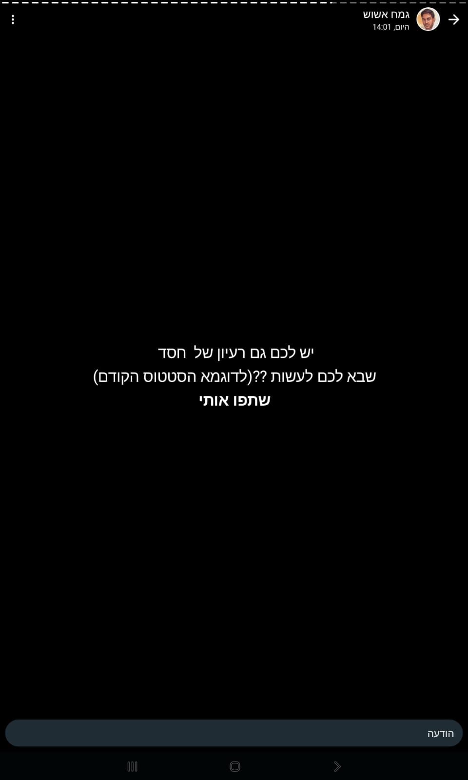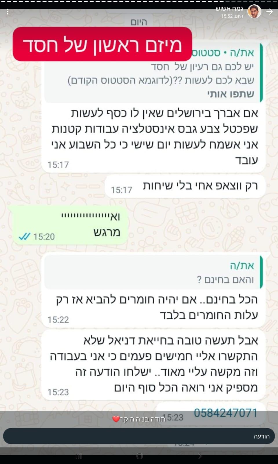 את הסטטוס של דניאל אשוש אין מי שלא מכיר. עשרות אלפים בכל רחבי הארץ, מכל הזרמים, עוקבים באדיקות אחר תעשיית החסד המתנהלת באמצעות הסטטוס, שמתברר כי הפך למכשיר ייעודי לעשיית חסד. בכל יום עולים אצלו עשרות ומאות חפצים, רהיטים ומכשירים חמליים במצב מצויין, שאין בהם צורך והם נמסרים ליעדם, חינם אין כסף - לידי אלו שזקוקים להם.