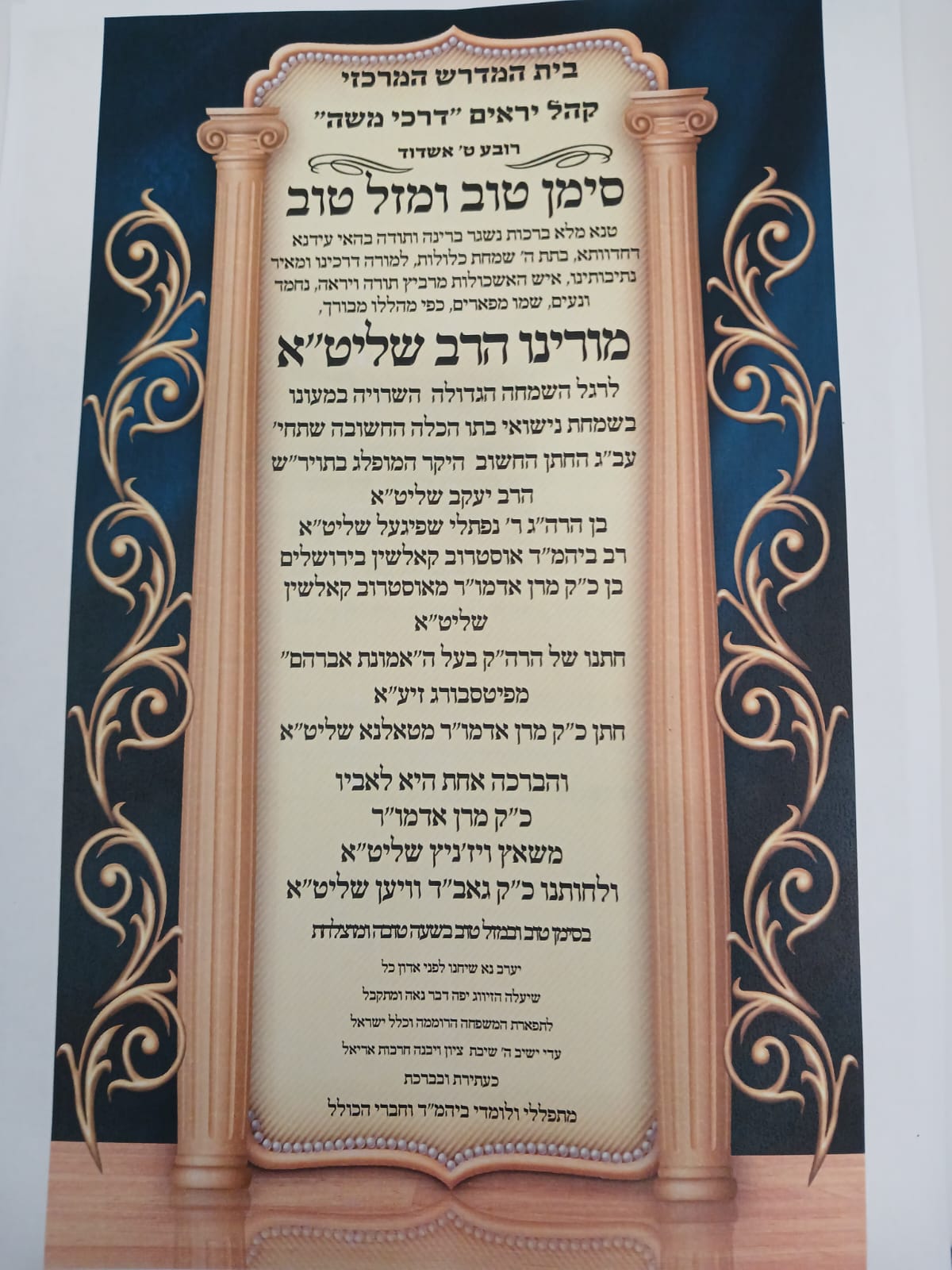 מדובר בשמחת חתונת בת הגר"ב הגר אב"ד "קהל יראים" אשדוד עם נכד הרבי הזקן מפיטבורג זצוק"ל ונכד האדמור מטאלנא שליט"א ולמעלה בקודש האדמור מביאלה פשיסחא שליט"א. החתונה תתקים בע"ה באולמי 'ממילא'.