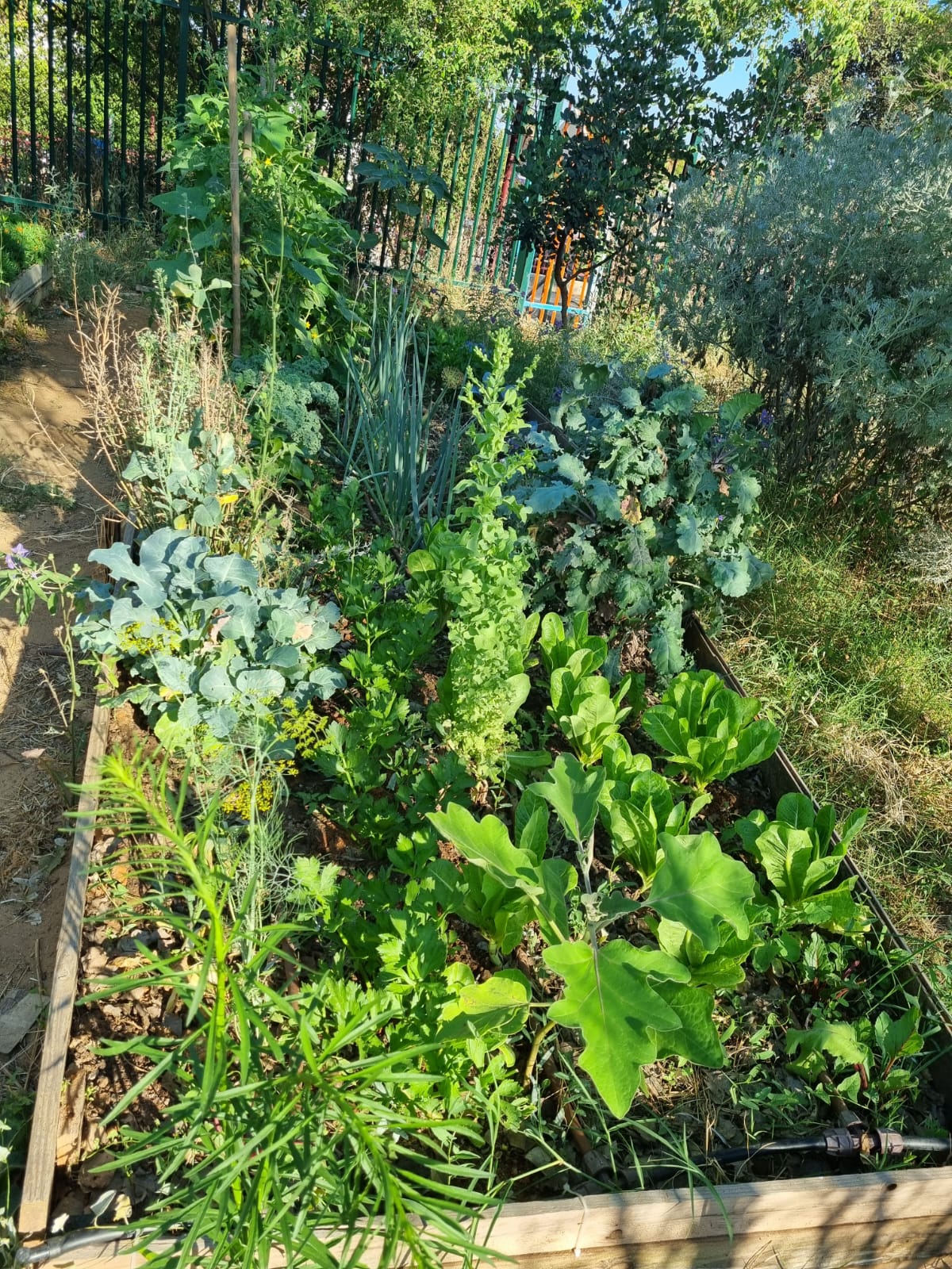 הדרך מתחילה במעבר הבנוי מעצים ממוחזרים, כעין חופה. מצדדיו בנויות אדניות, שמן הסתם יתמלאו בזמן הקרוב, בצמחים. לצד הדרך ערוגות לגידולים שונים, החצילים פורחים בצבע סגול, ושאר צמחי תבלין, חסות וירקות מאכל.
