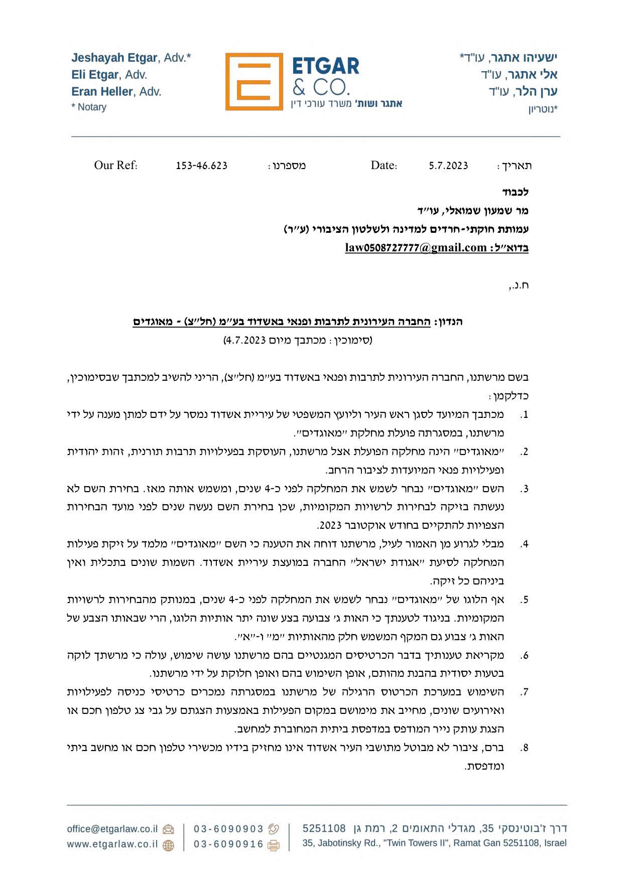 דורשין אותיות: במכתב תשובה מנומק שנשלח לעו"ד שמעון שמואלי מארגון 'חוקתי', משיבה עיריית אשדוד כי אין לפעילות 'מאוגדים' קשר למפלגת אגודת ישראל, וכי השם 'מאוגדים' אינו מעיד על זיקה ל'אגודת ישראל'. יתר על כן, גם האות ג' המודגשת ב'מאוגדים' אינה מלמדת על קשר וזיקה למפלגה האגודאית.