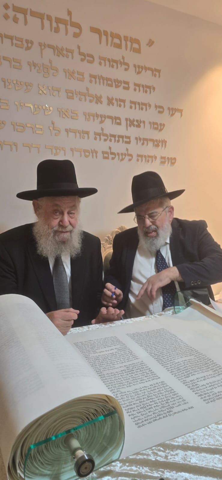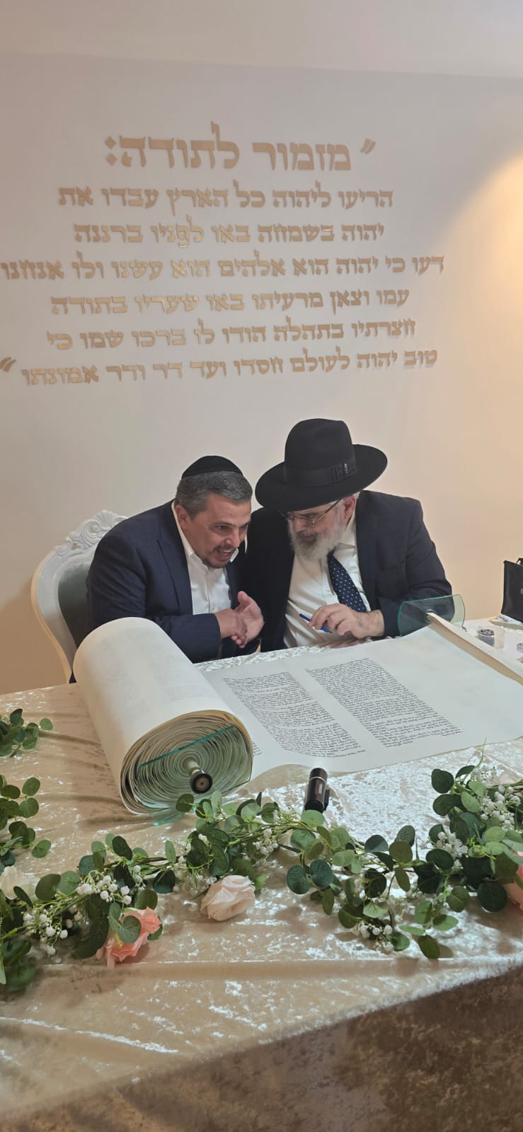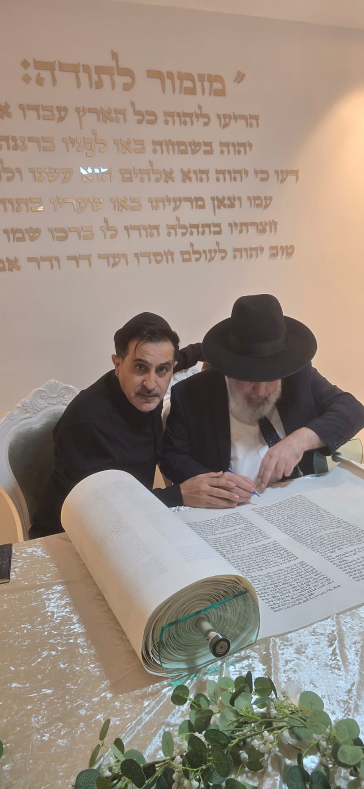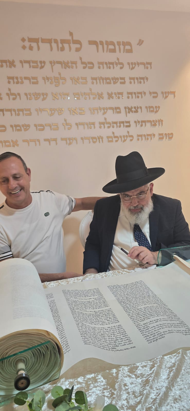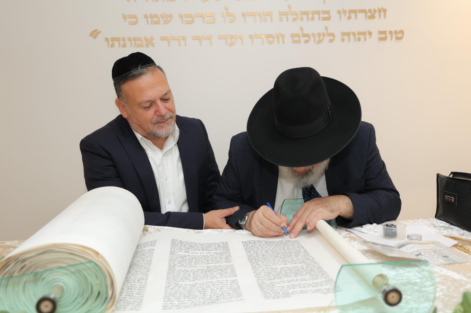 במשך כל זמן כתיבת האותיות, נכח הרה"ג ר' מכלוף עזריאל רב קהילה, ראש כולל "בני תורה" ורב בית הכנסת לשעבר. את האות האחרונה כתב וסיים בעלה ר' אורן שמחי הי"ו.