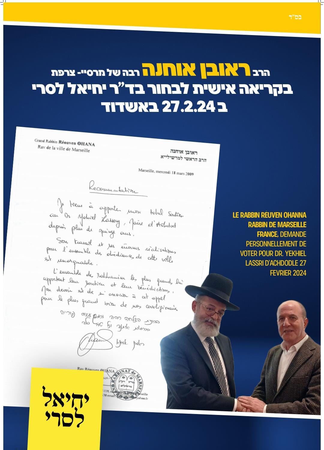 רבה של מרסיי שבצרפת הרב ראובן אוחנה קרא ליוצאי צרפת תושבי אשדוד לתמוך לראשות בד"ר יחיאל לסרי