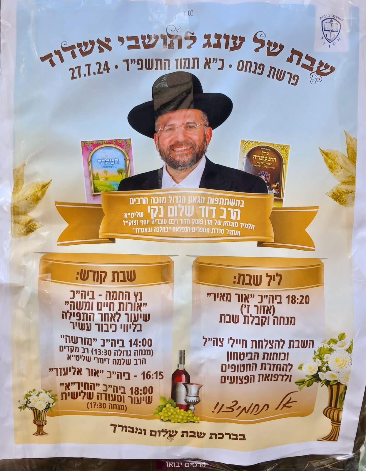 עם כניסת השבת ועד צאת השבת הרב דוד שלום נקי ימסור שיעורי הלכה בבתי הכנסת ברובעים ג' ו-ז'. שיעורי התורה וההלכה בסיוע הרב עובדיה דהן יו"ר המועצה הדתית להצלת עם ישראל, להצלחת חיילי צה"ל, השבת החטופים ולכל הפצועים שיחזרו בריאים ושלמים במהרה.
