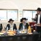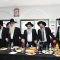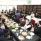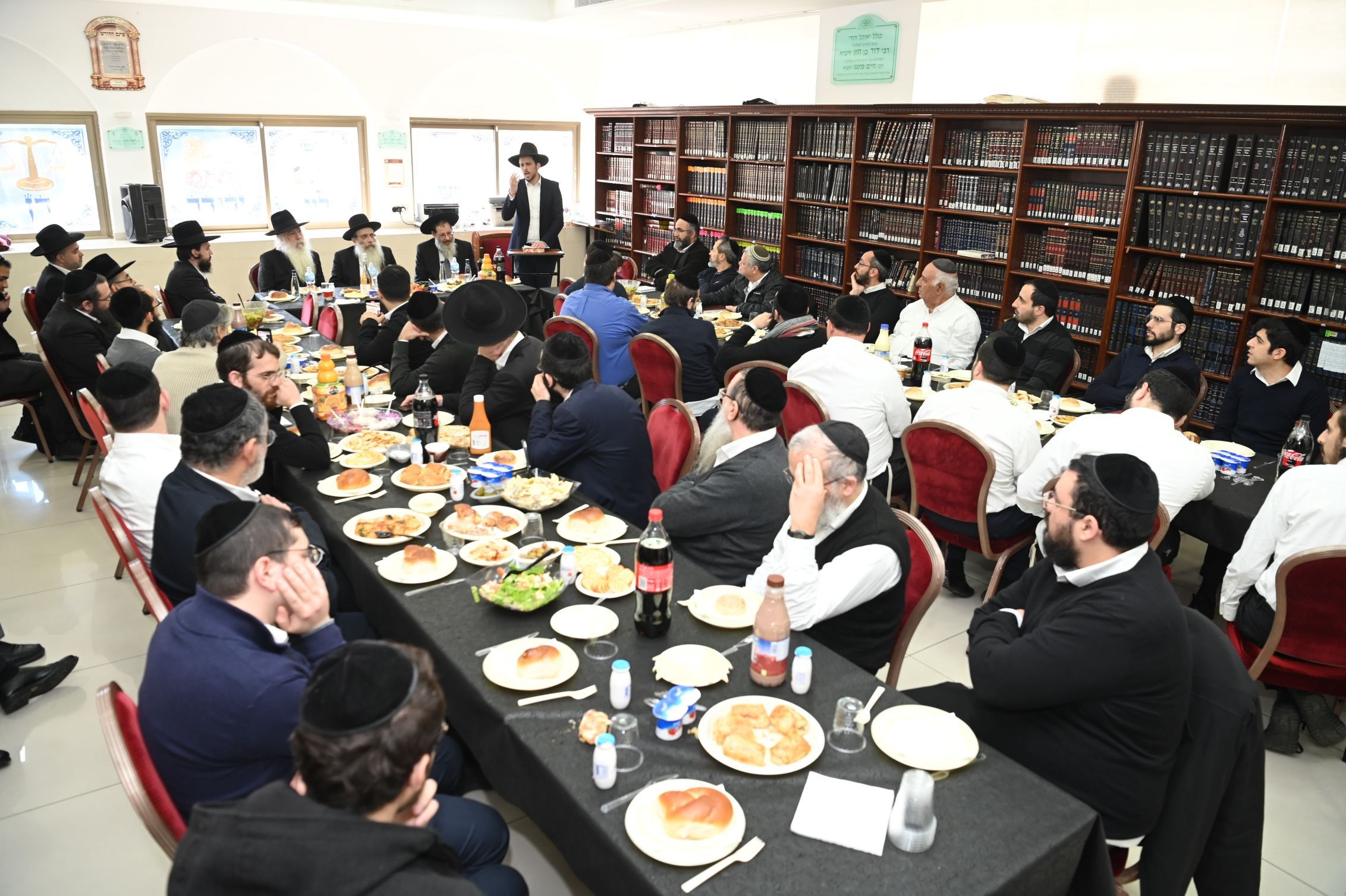 אברכי הכולל והמשתתפים בסיום המסכת היסבו לסעודת מצוה סביב שולחנות ערוכים בארוחת בוקר עשירה.