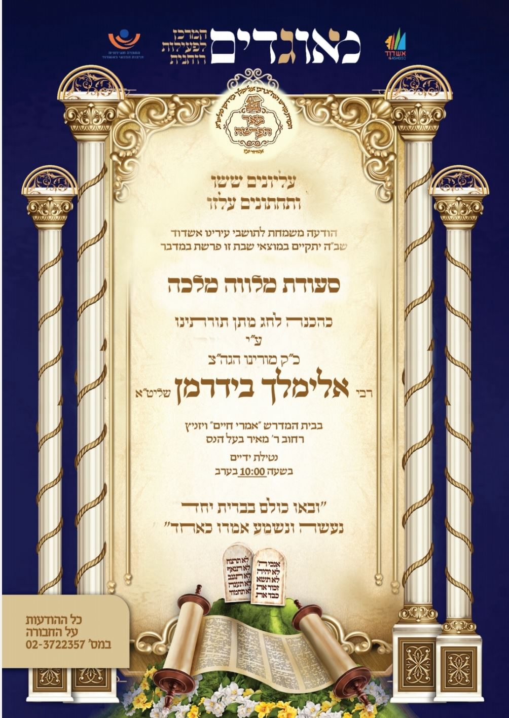 הסעודה, בה ישמיע המשפיע מדברותיו, תתקיים בביהמ"ד ויזניץ ברובע ז', ובסיוע 'מאוגדים'.
