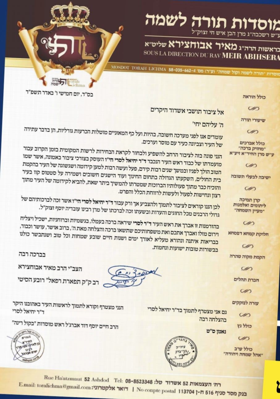 לכן הננו קוראים לציבור לתמוך ולהצהיע אך ורק עבור ראש העיר ד"ר יחיאל לסרי הי"ו, אשר זכה לברכותיהם של גדולי הרבנים מכל החוגים והעדות ובשעתו זכה לברכתו של מרן רבינו עובדיה יוסף זצוק"ל.