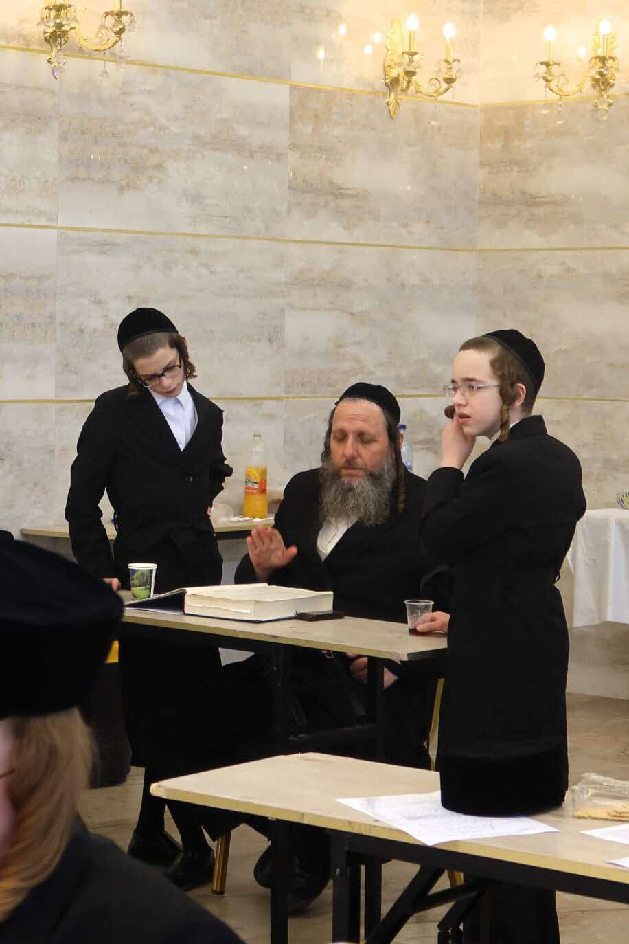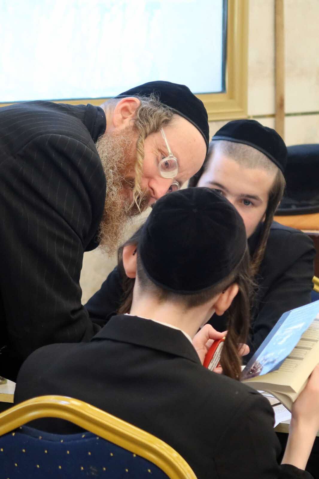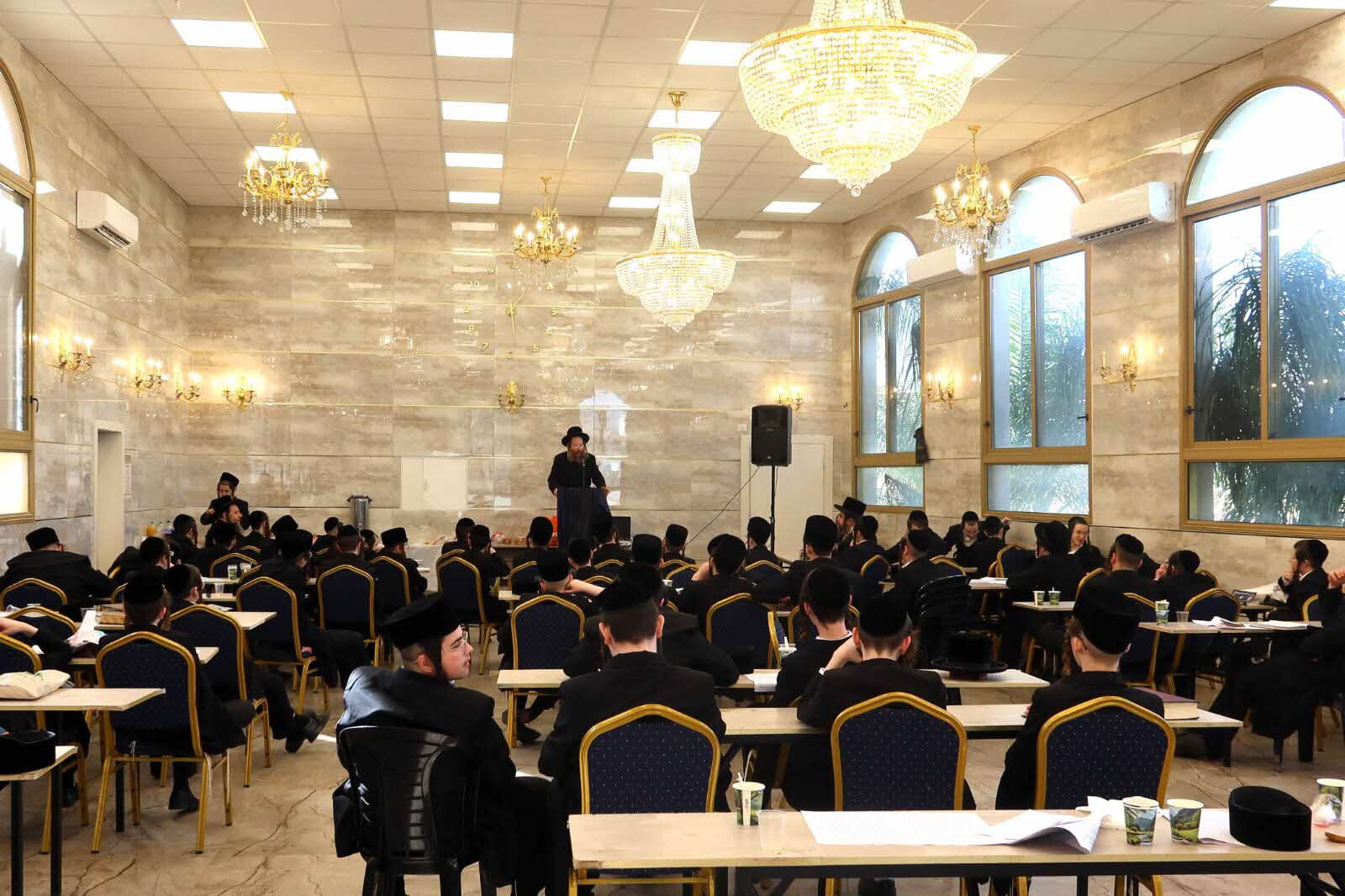 תחילה התקיימה סדר לימוד של 'שלוש שעות רצופות', באולם המפואר בקרית צאנז בטבריה עילית. הר"מ הרה"ג ר' ישראל גליק שליט"א מסר שיעור מרתק בהלכות נזקין, מעניני הסוגיות הנלמדות כעת בישיבה, במהלכו התפתח משא ומתן הלכתי סוער בין הרמי"ם ותלמידי הישיבה.