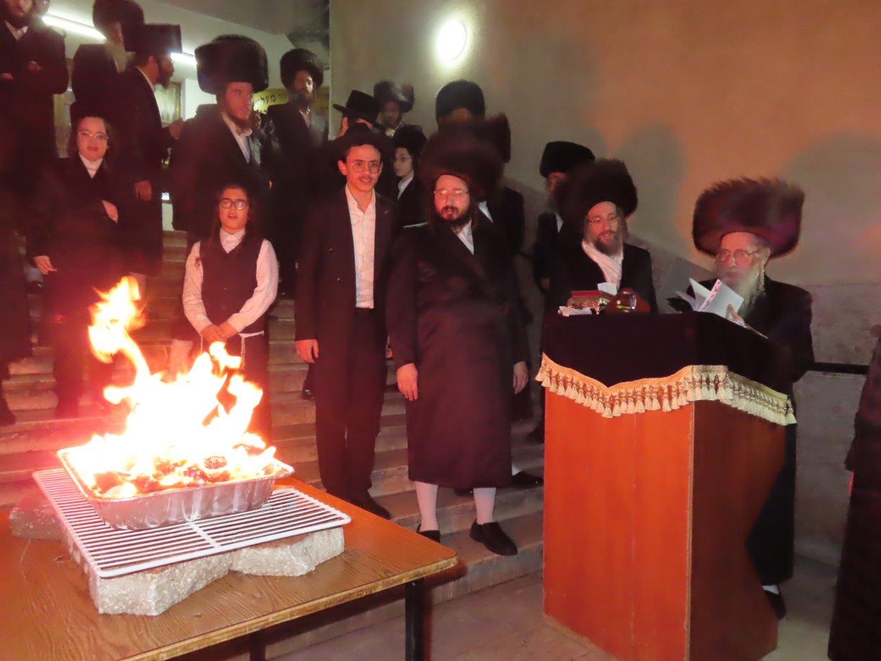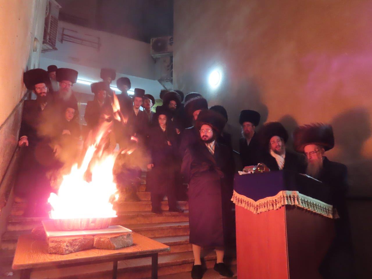 במוצאי שבת לאחר סעודת מלוה מלכה בחצר הקודש מעליץ בבית מדרשו ברובע ח' הרבי שליט"א חילק למשתתפים 'שום' לברכה. לאחר מכן יצאו לרחבה ליד המדרגות המובילות לבית המדרש, שם הכינו את שיירי הפתילות מחנוכה בתוך מגש ענק. הרבי ממעליץ הדליק את שיירי הפתילות והסביר, כי מנהג ישראל תורה לשרוף את הפתילות הנרות מהדלקת נרות חנוכה, ומבואר בזה טעם כדי שלא תהיה בהם אחיזה לקליפות. ויש להתבונן איזו אחיזה יכולה להיות להם בזה. ובאמת כבר בשעת ההדלקה אמרנו 'הנרות הללו קודש הם ואין לנו רשות להשתמש בהם', כי אסור שתהיה בהם שום אחיזה. כשהשלהבת עלתה, האדמו"ר ממעליץ פתח בזמר בר יוחאי יחד עם כל המשתתפים, לאחר מכן שרו אמר רבי עקיבא אשריכם ישראל. השיר האחרון ששרו לפני שכבתה האש זה, קרני רשעים אגדע תרוממנה קרנות צדיק.