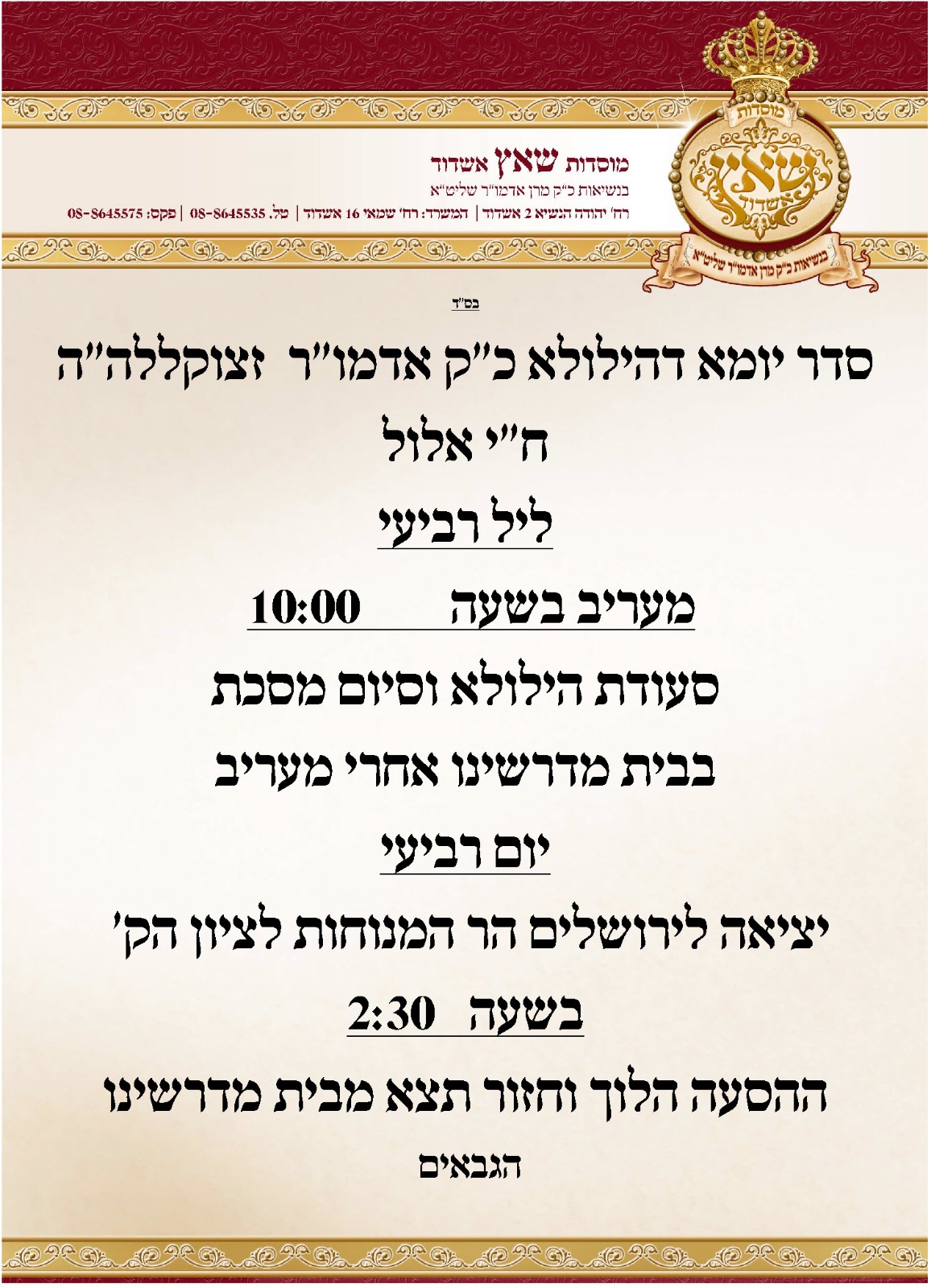 בבית המדרש שאץ ציינו את הילולת האדמו"ר זצ"ל בסעודה ובסיום הש"ס. היום תתקיים העליה לציון