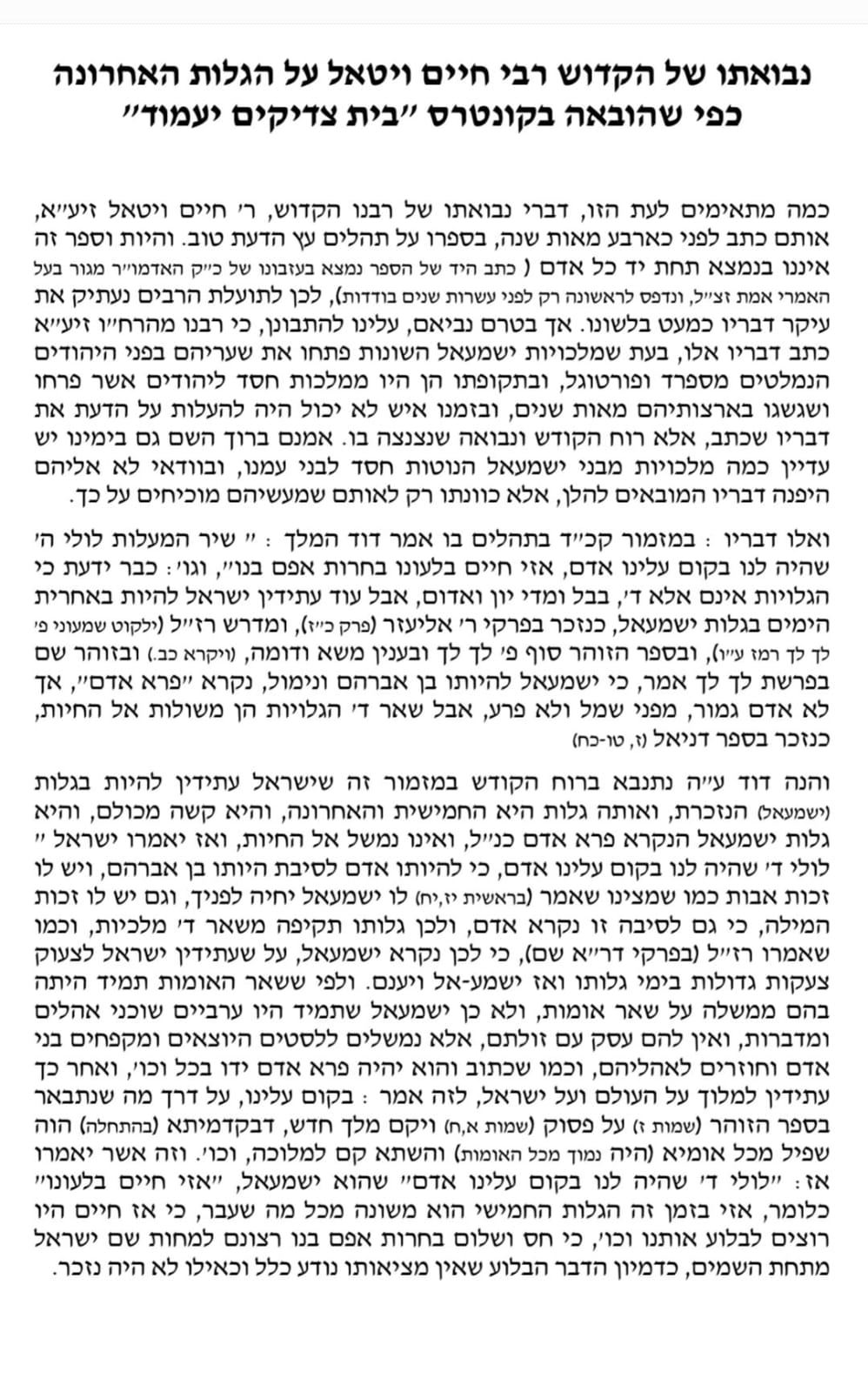 באיגרת הביא את דברי הנבואה של המזבח הטהור הקדוש רבי חיים ויטאל זיע"א על הגלות האחרונה.