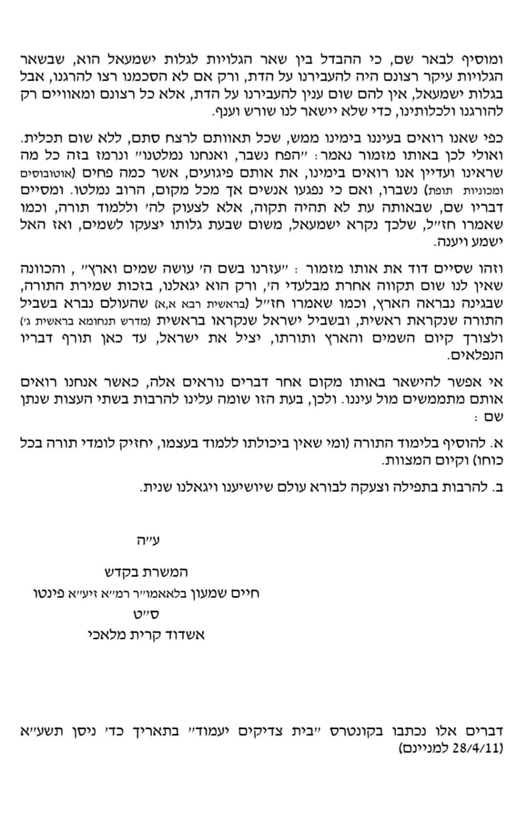 בצל האסון הנורא והמחריד שאירע ביום שמחת תורה, המרא דאתרא הגה"צ רבי חיים שמעון פינטו שליט"א פרסם איגרת שכתב בשעתו ופרסם בקונטרס "בית צדיקים יעמוד" בתאריך כד' ניסן תשע"א ודברים אלו מתאימים ממש לימים אלו.