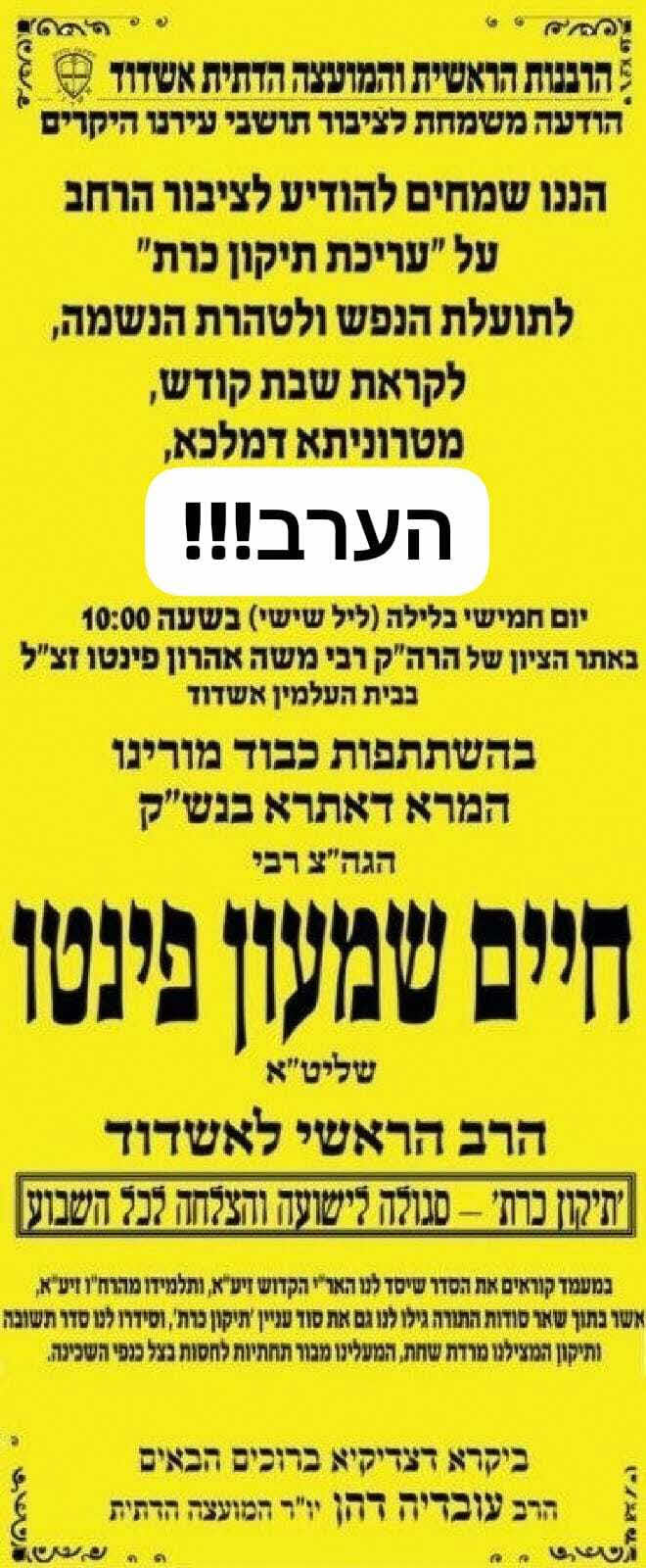הרב פינטו ציין כי הערב לאחר הלימוד בסדר ה'תיקון כרת' המתקיים מידי ליל שישי בציון אביו הרה"צ רבי משה אהרון פינטו זצ"ל בבית העלמין, קודם התרת נדרים ישא דברי התעוררות קצרים ובדבריו יעלה את זכרו של הגרד"צ קרלנשטיין זצ"ל ויערוך אשכבה לעילוי נשמתו.