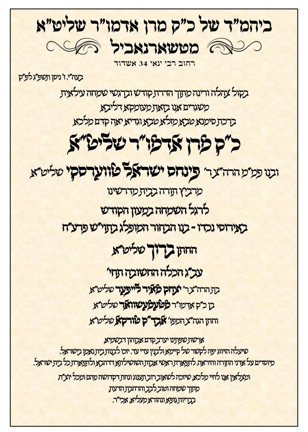 בטשאנאביל חגגו את אירוסיו של נכד האדמו"ר, עם נכדת האדמו" רמטמשוואר שליט"א מבני ברק. צפו בתמונות ממצלמתו של שוקי לרר