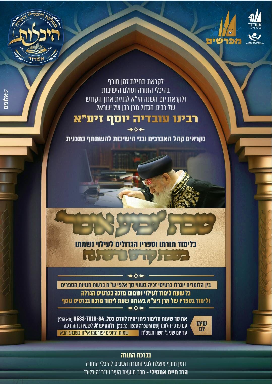 עם תחילת זמן חורף בהיכלי התורה ועולם הישיבות, ולאור קריאתם של מרנן ורבנן שליט"א עקב המצב הקשה השורר בארה"ק להוסיף חיזוק ושקידה בעמלה של תורה שהיא מגנא ומצלא, ארגון 'היכלות – ממלכת היכלי התורה אשדוד' מזמין את קהל בני התורה, אברכים, בני הישיבות ועמך בית ישראל להשתתף בתכנית "שבת יביע אומר".