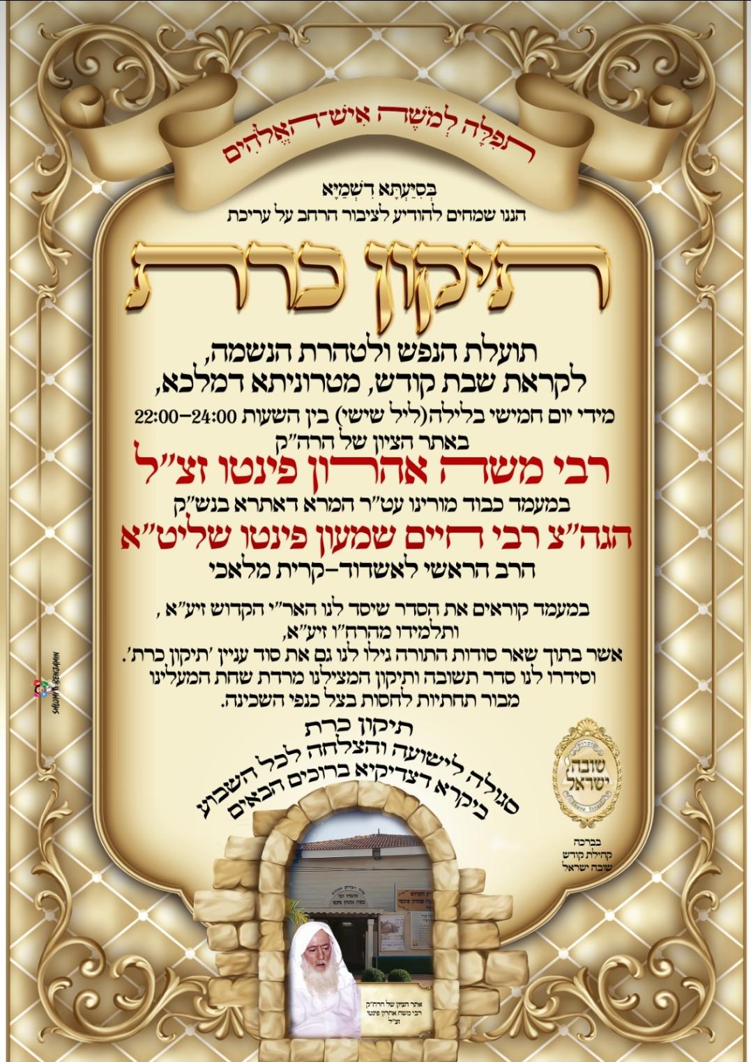 הערב ליל שישי חוזרים שוב לסדר לימוד "תיקון כרת" במעמד המרא דאתרא הגה"צ רבי חיים שמעון פינטו שליט"א וציבור רחב המגיע להשתתף מרחבי הארץ, באוהל הציון של הרמ"א פינטו זצ"ל בבית העלמין.