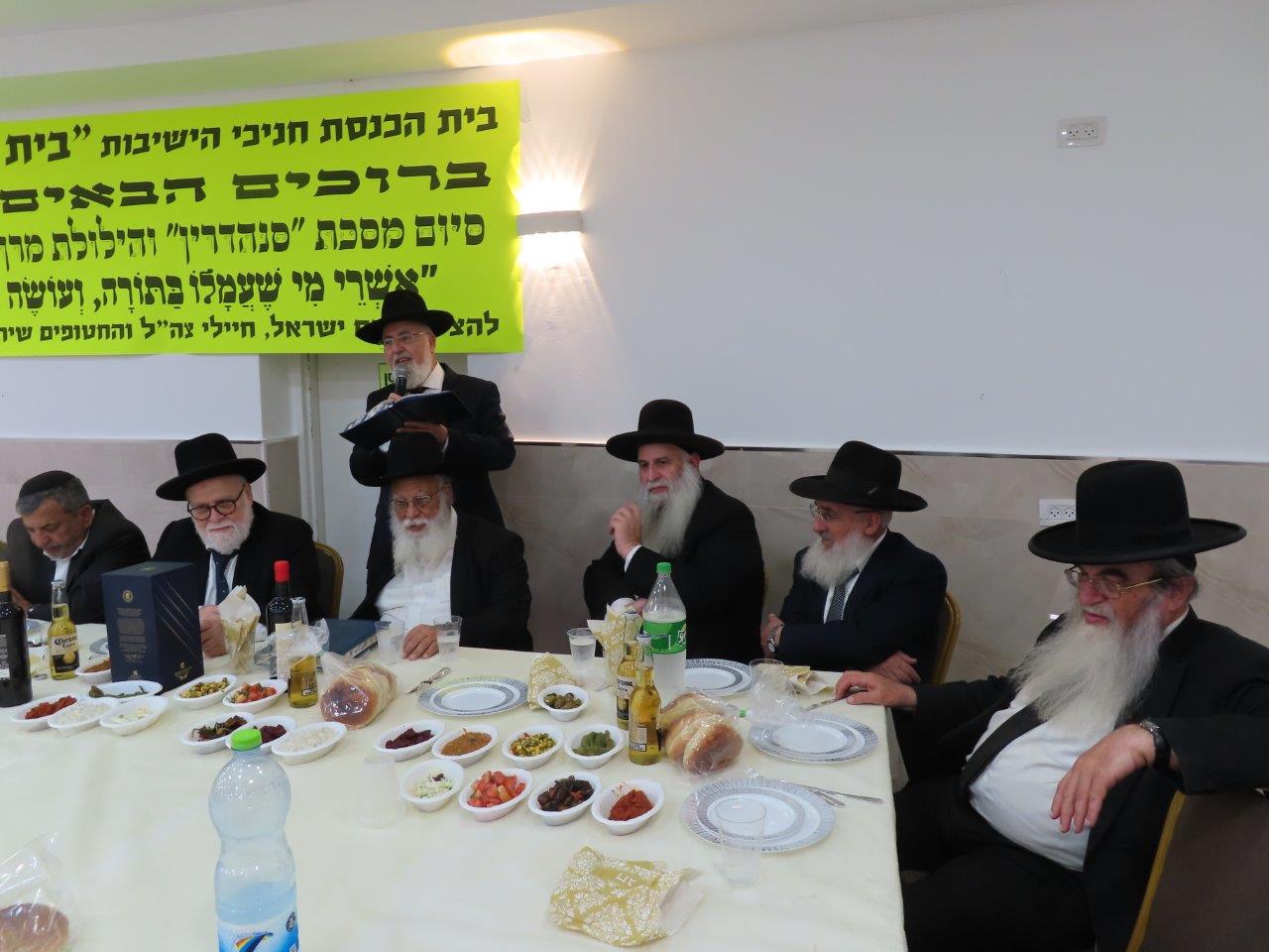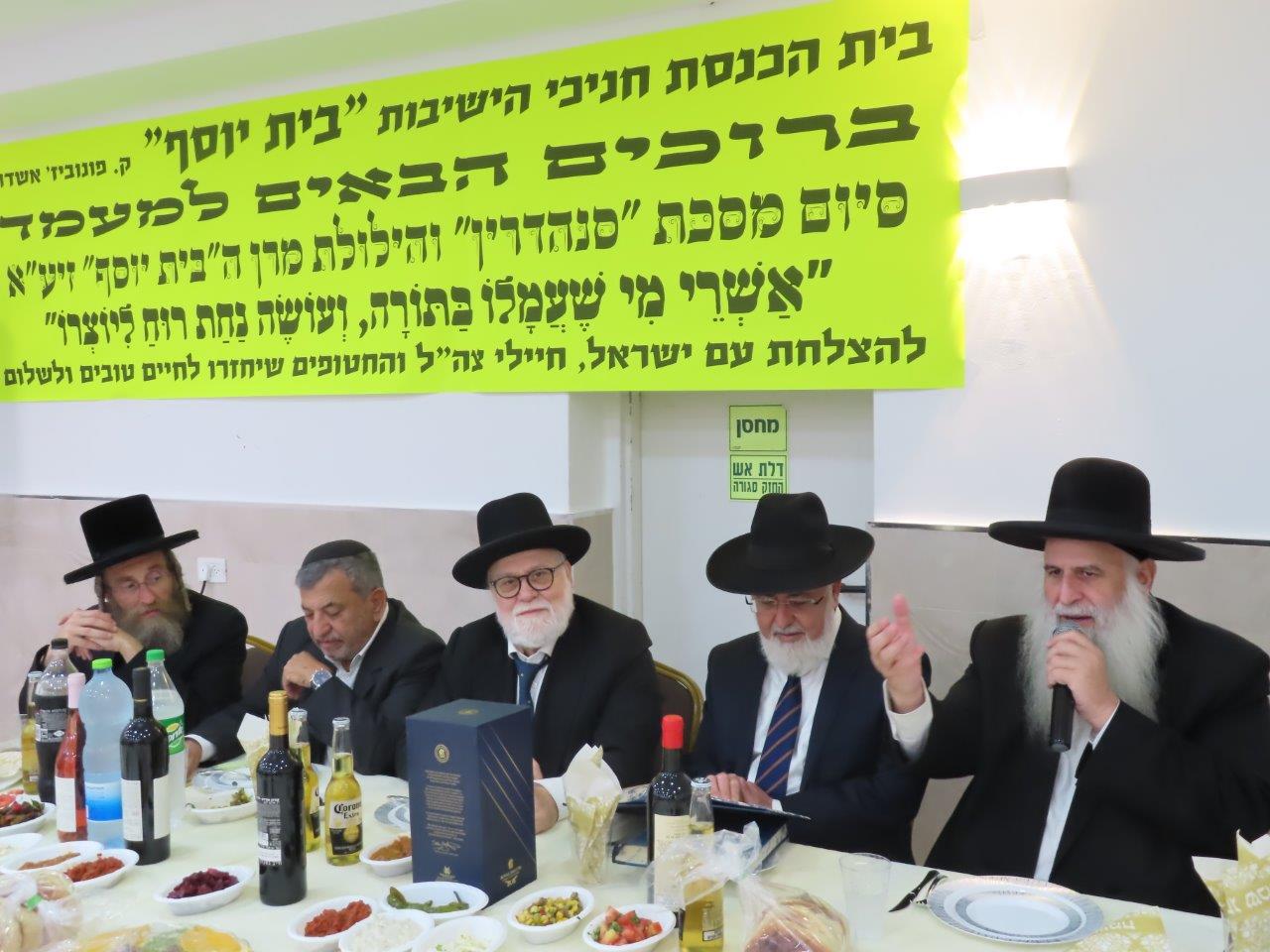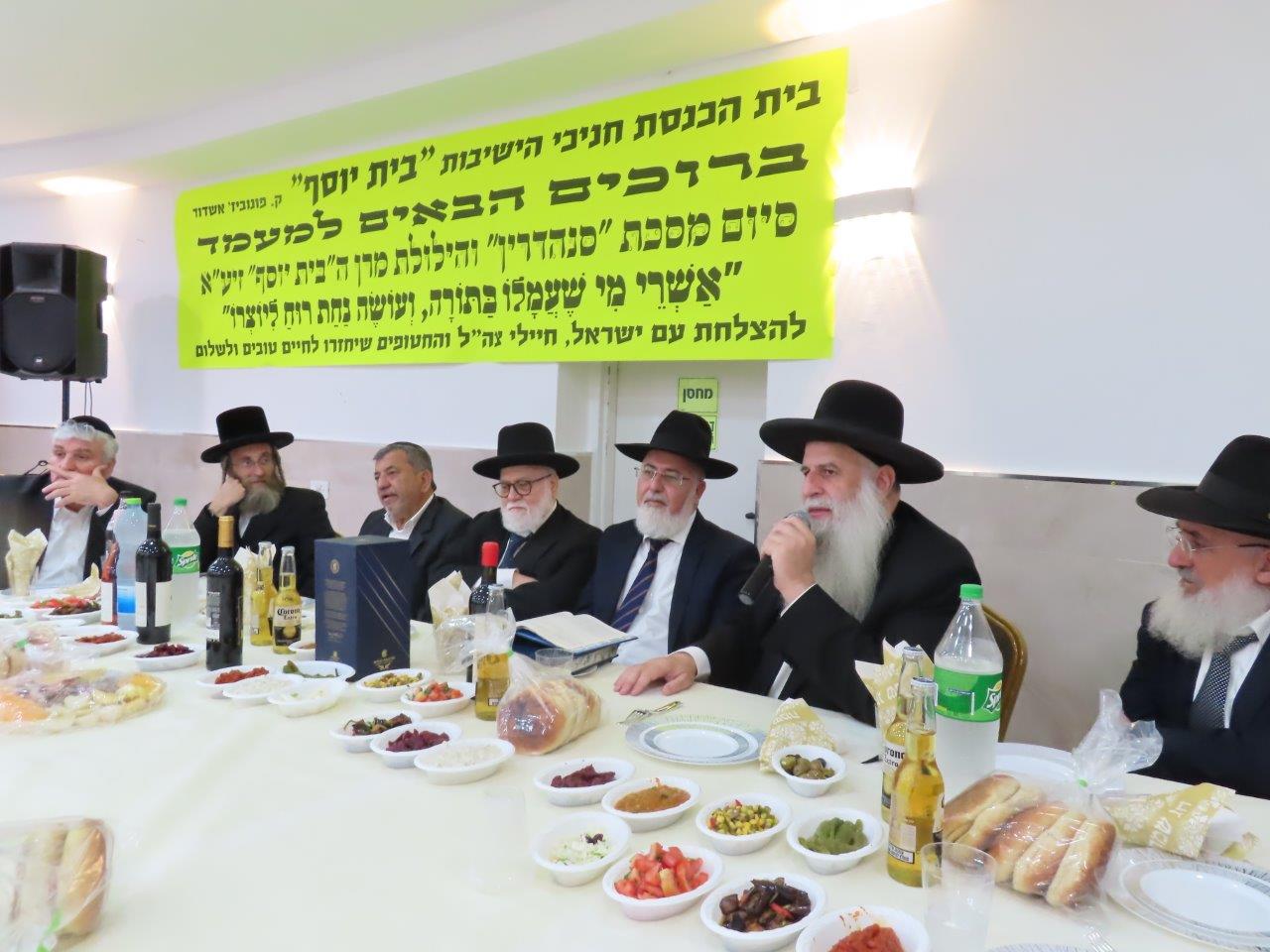 סמוך לחג הפסח, משתתפי השיעור הקבוע במסגרת הלימוד בדף היומי בבית הכנסת חניכי הישיבות "בית יוסף" באשדוד חגגו סיום על מסכת "סנהדרין" באולם שע"י בית הכנסת "נר דוד ואוהל רחמה" ברובע ט', סביב שולחנות ערוכים מכל טוב כיאה לכבודה של תורה.