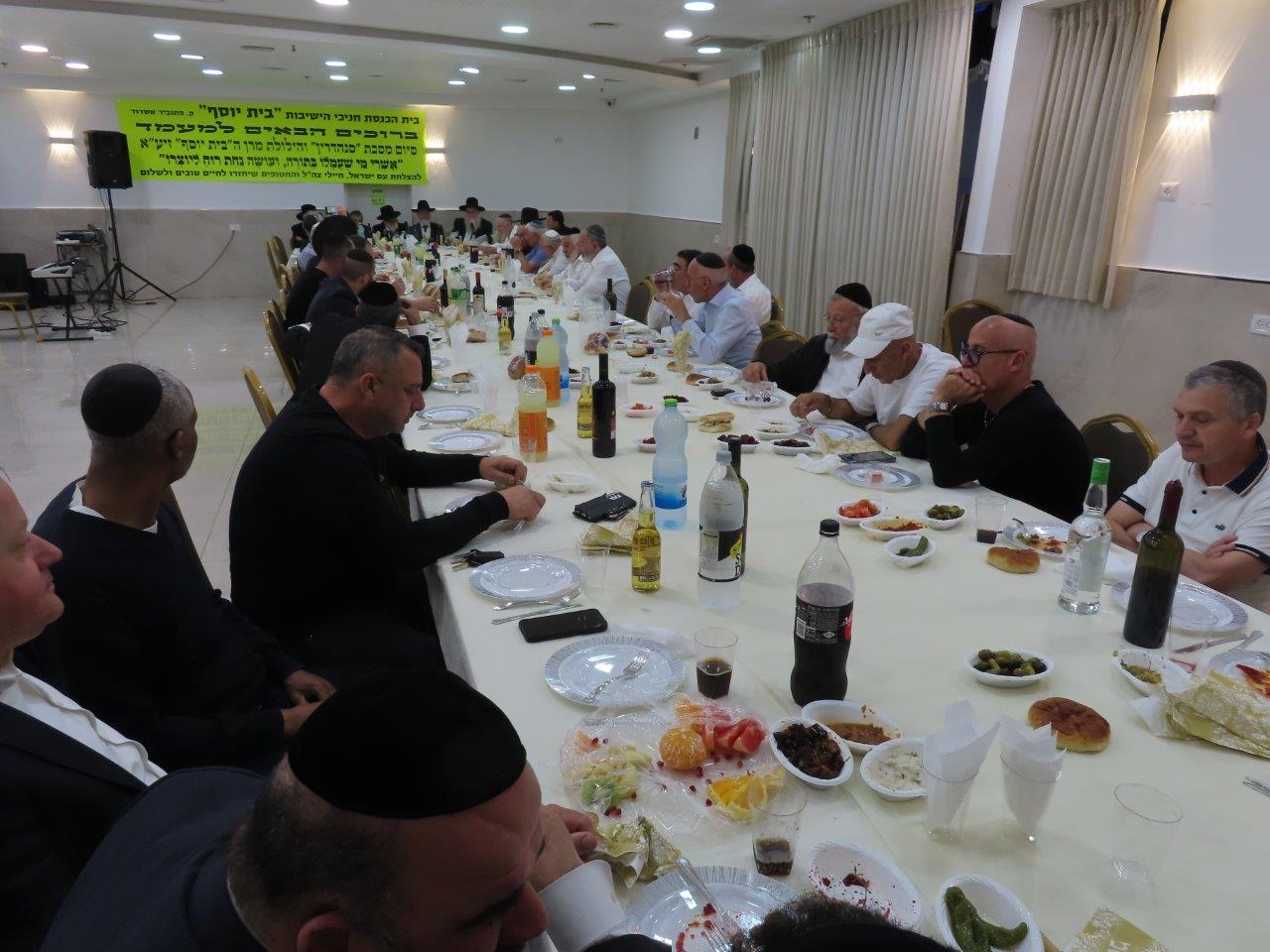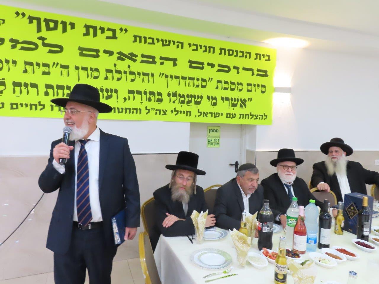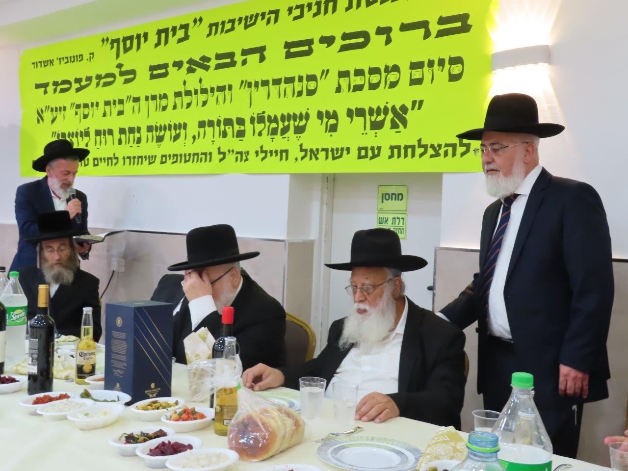 סמוך לחג הפסח, משתתפי השיעור הקבוע במסגרת הלימוד בדף היומי בבית הכנסת חניכי הישיבות "בית יוסף" באשדוד חגגו סיום על מסכת "סנהדרין" באולם שע"י בית הכנסת "נר דוד ואוהל רחמה" ברובע ט', סביב שולחנות ערוכים מכל טוב כיאה לכבודה של תורה.