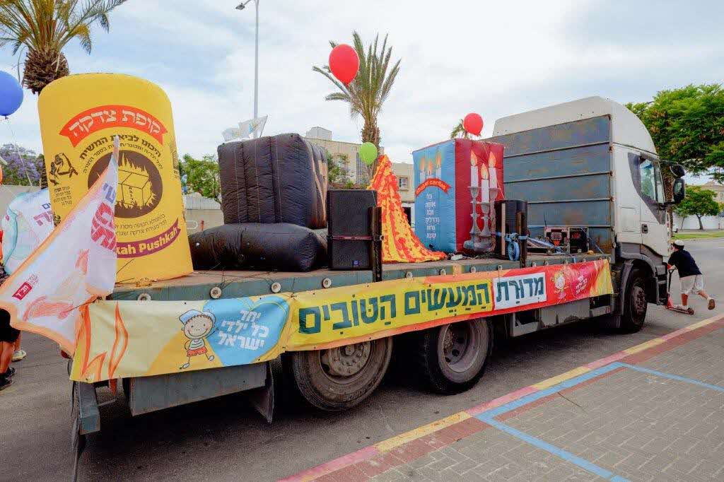 בשעות אחר הצהריים ילדים וילדות צעדו יחד עם משפחותיהם ברובעים טו' יז' כשהם מצוידים בכובעים ובשלטים בהם סיסמאות לאהבת ישראל וקיום המצוות, בראש התהלוכה צעדו משאיות ענק מקושטות עם מצגי ענק של תפילין, נרות שבת, צדקה ועוד מצוות יקרות. מרגש היה לראות את צעדת הילדים כשתופים בידיהם בלבוש ססגוני, גם נהגי המכוניות שנסעו לצידם השתתפו בתהלוכה, כאשר צפרו לעברם כאות הזדהות עם התהלוכה היפה והססגונית של ילדי העיר ברובע.