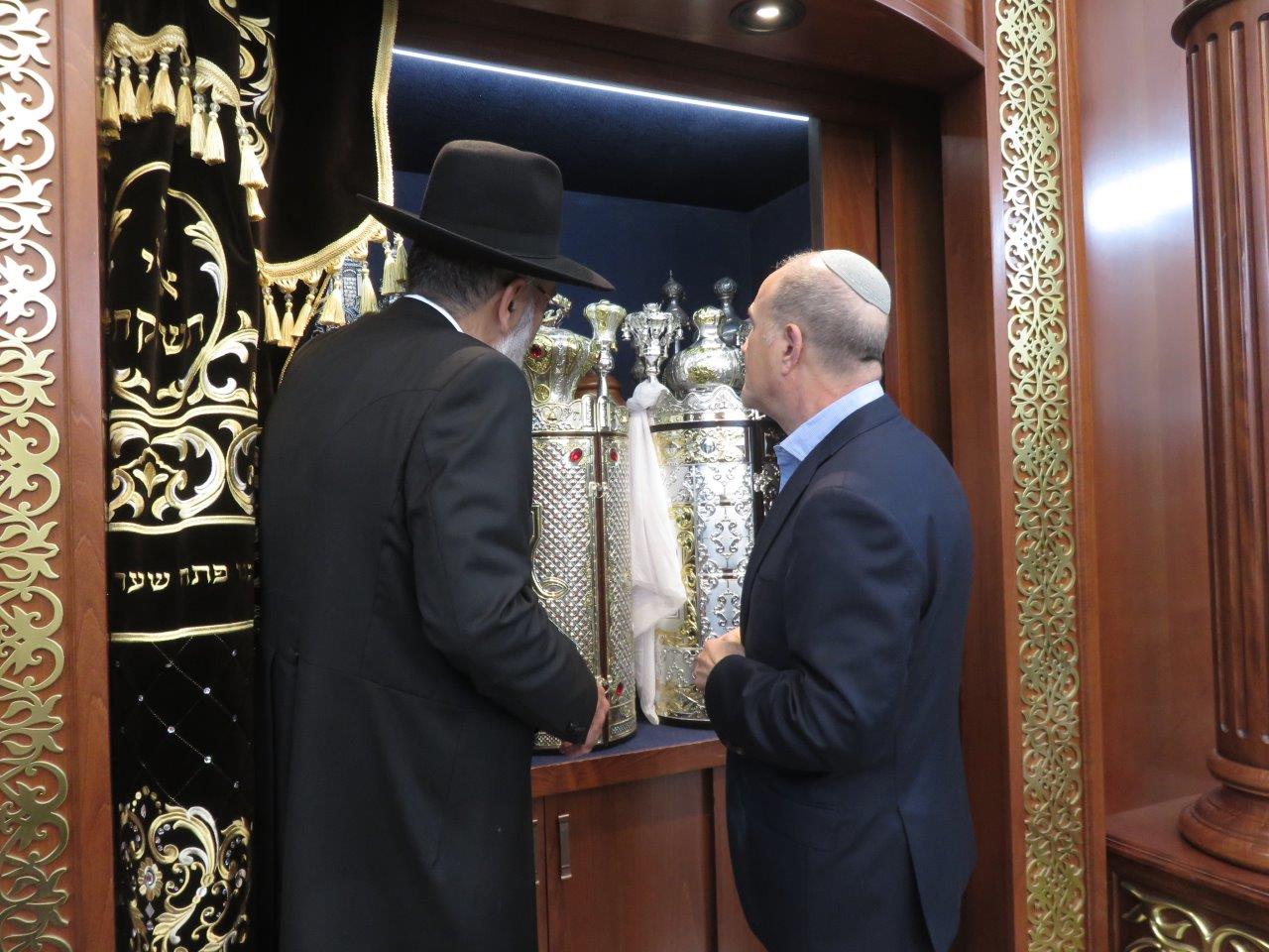 לאחר אמירת מזמור לדוד וימלוך ד' כנהוג מפי הגר"א בן-חמו, הוכנסו שלושת ספרי התורה בזה אחר זה ע"י התורמים להיכל ארון הקודש ונגשו לתפילת ערבית חגיגית ברוב עם. קודם הסעודה הגר"א בן חמו ערך סיור קצר לידיד המוסדות ראש העיר ד"ר יחיאל לסרי והראה לו את ספרי התורה, ראש העיר הביע את התפעלותו מהפאר וההדר וההשקעה הגדולה בבית הכנסת, שהוא מבין היפים שבעירנו עם היכל קודם גבוה ומרשים עד למאוד.