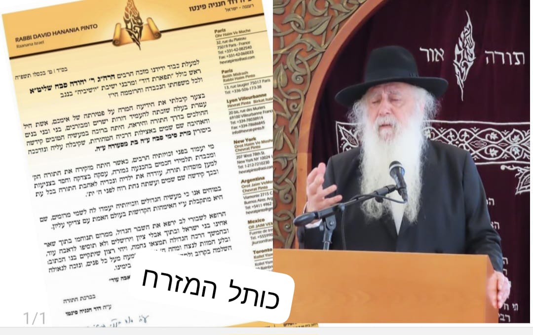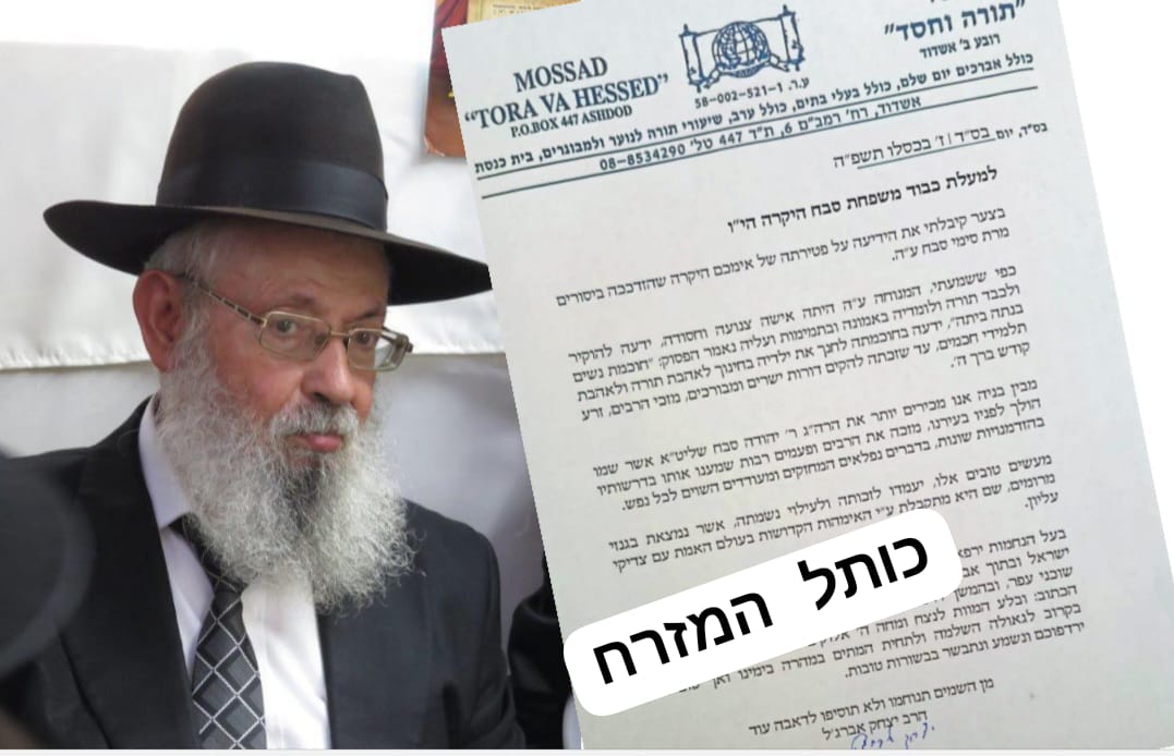במכתב כתב, למעלת כבוד ידידנו מזכה הרבים הרה"ג ר' יהודה סבח שליט"א ראש כולל "תפארת דוד" ומרבני ישיבת "יושיביה" בנגב ולכל משפחתו הנכבדה והרוממה הי"ו.