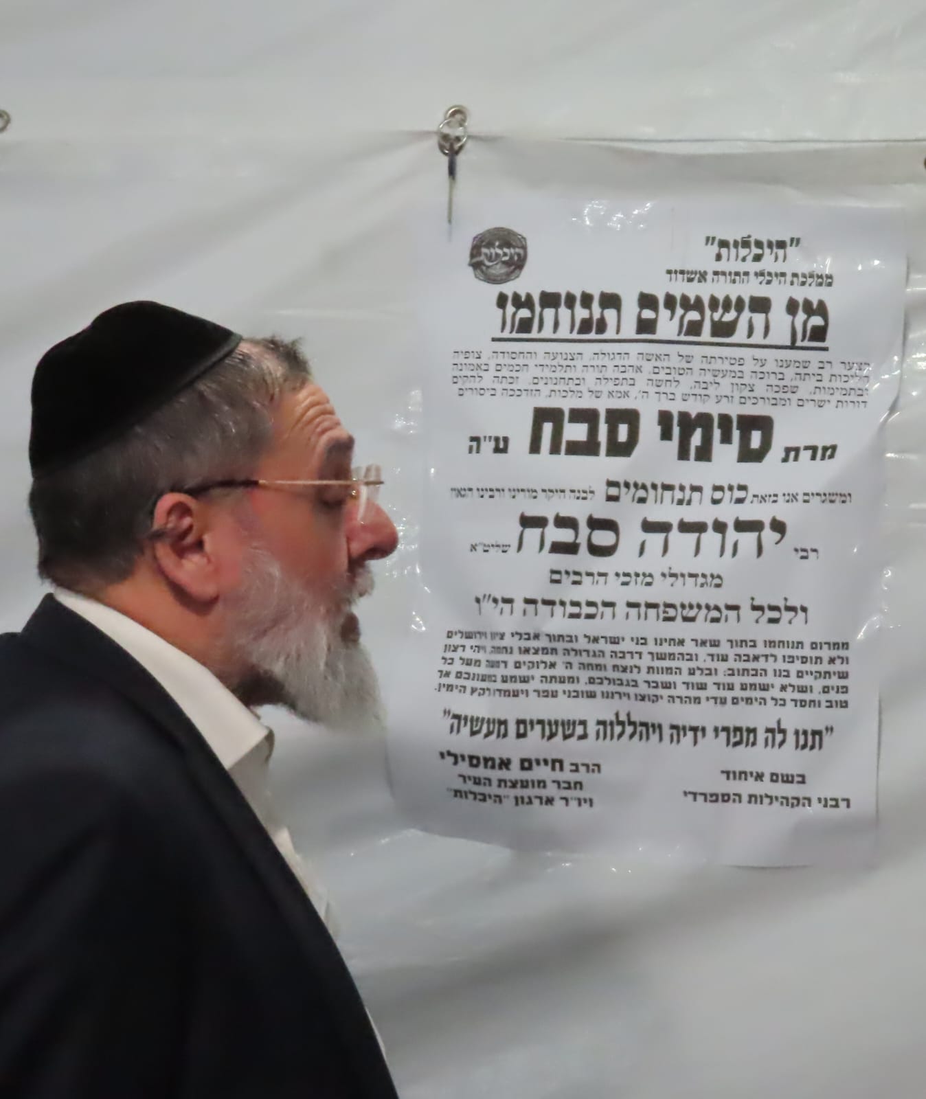 זקן רבני אשדוד הגה"צ רבי יצחק אברגל שליט"א בעל ה"ברכת יצחק" וראש כולל "תורה וחסד" אשר מפאת חולשתו, שלח איגרת תנחומין לבניה הרבנים שליט"א ע"י חתנו הרב עובדיה דהן שליט"א יו"ר המועצה הדתית.