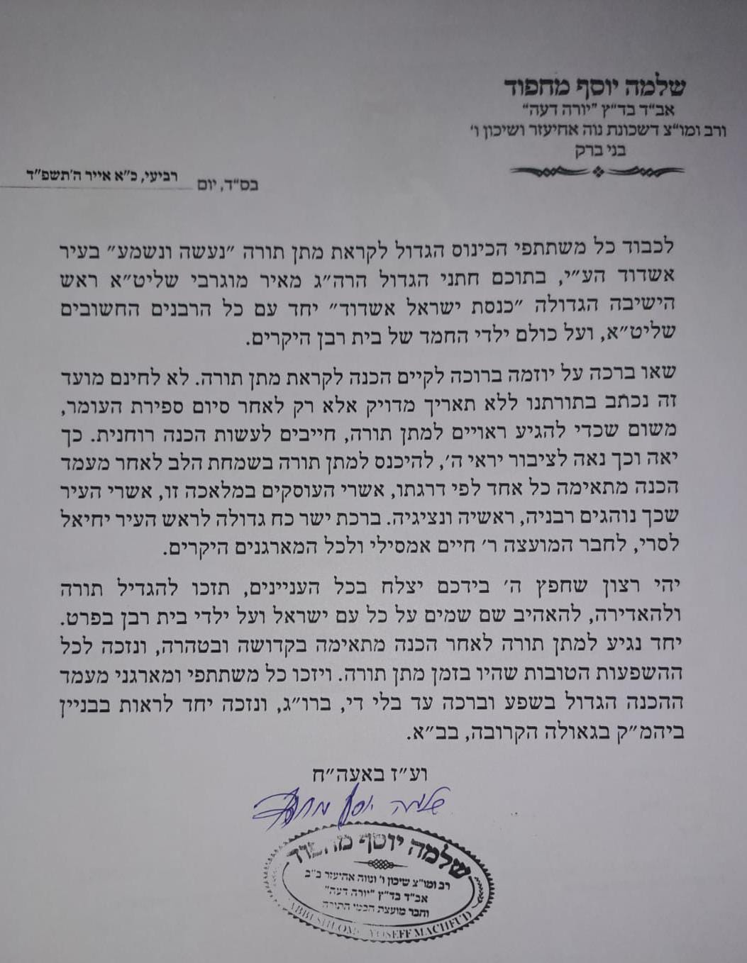 לכבוד כל משתתפי הכינוס הגדול לקראת מתן תורה "נעשה ונשמע" בעיר אשדוד הע"י, בתוכם חתני הגדול הרה"ג מאיר מוגרבי שליט"א ראש הישיבה הגדולה "כנסת ישראל אשדוד" יחד עם כל הרבנים החשובים שליט"א, ועל כולם ילדי החמד של בית רבן היקרים. שאו ברכה על יוזמה ברוכה לקיים הכנה לקראת מתן תורה. לא לחינם מועד זה נכתב בתורתנו ללא תאריך מדויק אלא רק לאחר סיום ספירת העומר, משום שכדי להגיע ראויים למתן תורה, חייבים לעשות הכנה רוחנית.
