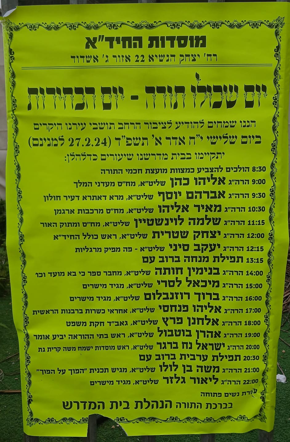 בבית המדרש ישיבת ''החיד"א'' בראשותו של הרב דוד שטרית מארגנים יום שכולו תורה, בו ישתתפו מאות רבים שיחליטו לנצל את הזמן ללימוד תורה בשמיעת שיעורי תורה והלכה. כבר בשעות הבוקר לאחר תפילת שחרית הגיעו קהל רחב לשיעור הראשון כאשר לפני כן ממשו את זכות הבחירה "לשמוע בקול חכמים". בנוסף גם הרבנים והמרצים חוזרים בכל פעם בתחילת השיעור, כי 'מי שעדיין לא הספיק לצאת לבחור לראשות העיר ולמועצה, יצא ויחזור לשיעורים.