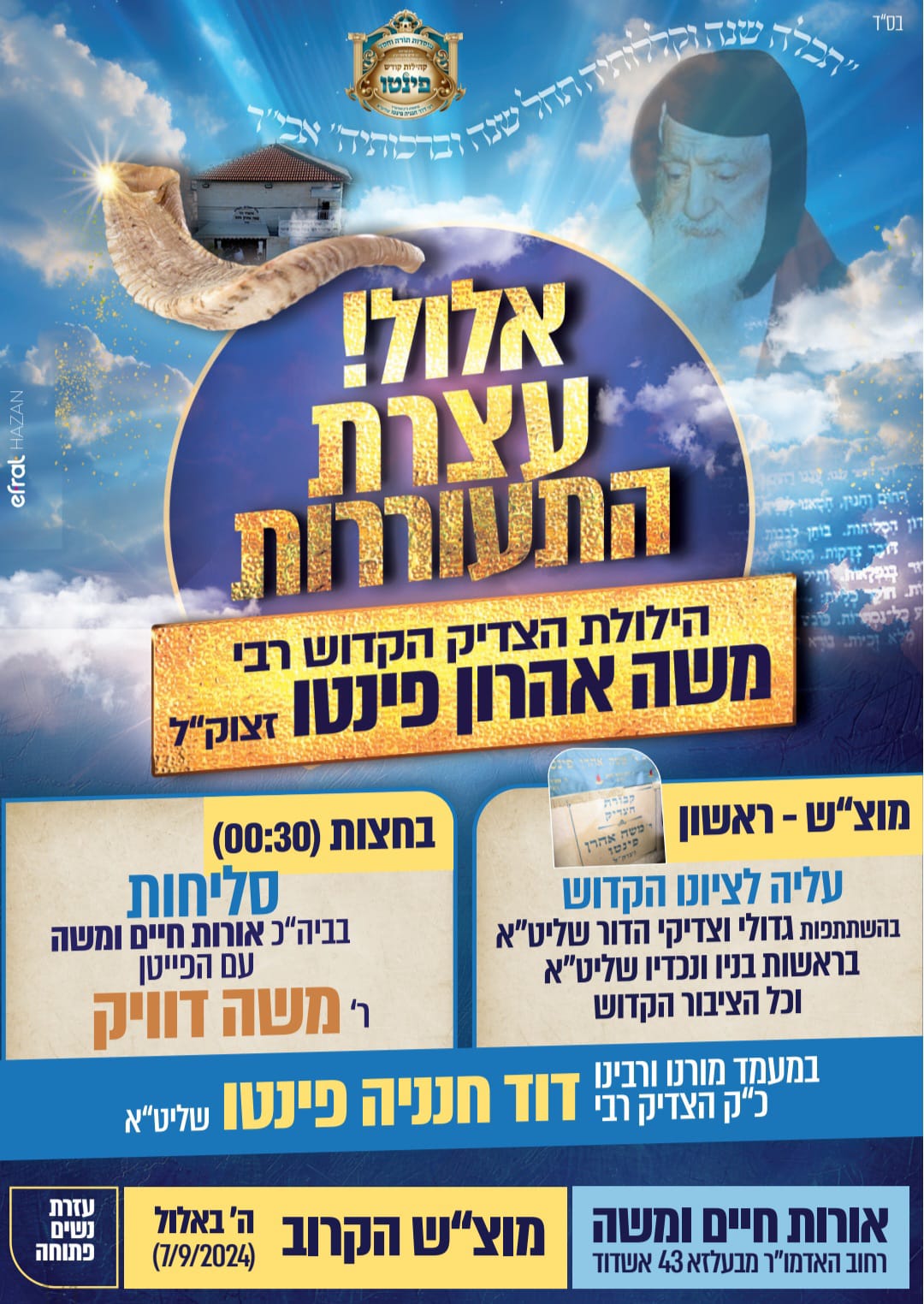 בְּמוֹצָאֵי יוֹם מְנוּחָה: תכונה וההיערכות רבה לקראת מוצאי שבת קודש (שופטים), לכבוד בעל ההילולא זצ"ל, יתקיים עצרת והתעוררות ואמירת סליחות מרכזית בהיכל בית המדרש הגדול שע"י מוסדות "אורות חיים ומשה" בקרית "באר משה" רובע ג' במעמד בנו האדמו"ר הגה"צ רבי דוד חנניה פינטו שליט"א נשיא ממלכת התורה "אורות חיים ומשה" אשר ישמיע מדברות קודשו קודם הסליחות בשעה 12:30 בלילה.