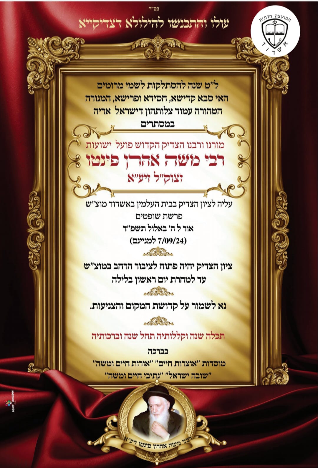 השבת יציינו בקרב רבים מתושבי אשדוד, תלמידי ואוהדי האדמור"ים הרבנים הצדיקים לבית משפחת פינטו שליט"א את שבת ההילולא להאי חסידא קדישא ופרישא עמוד צלותהון דישראל, המלומד בניסים, פועל ישועות, מורנו ורבנו הצדיק רבי משה אהרון פינטו זצוק"ל שרבים נושעו מברכותיו, במלאת טל' שנים להסתלקותו.