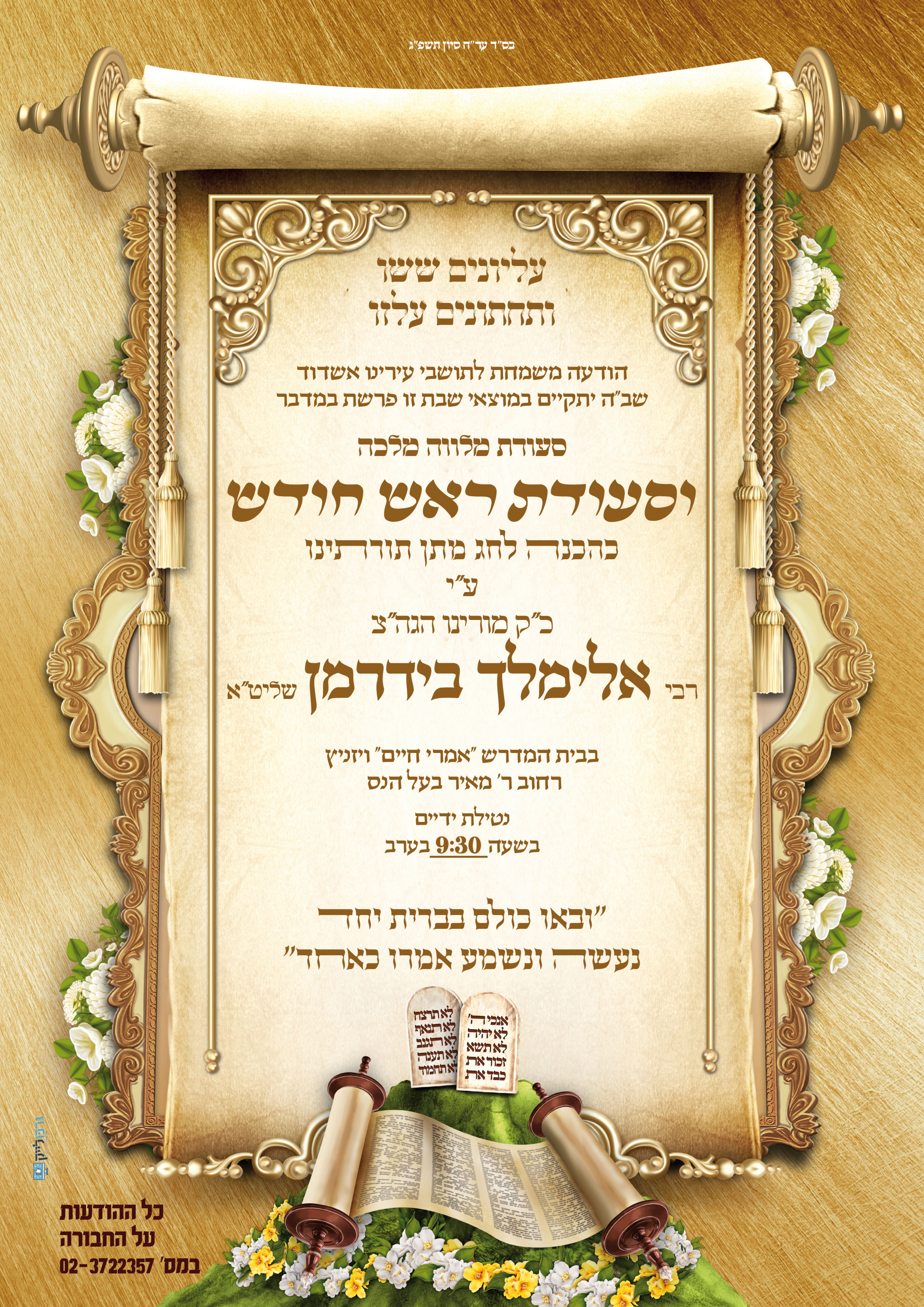 נערכים לחג מתן תורה: לשמחת ליבם של תושבי העיר, תתקיים בע"ה במוצ"ש סעודת מלווה מלכה רבתית בשילוב סעודת ראש חודש סיון והכנה לחג מתן תורתינו, בהשתתפותו של הרה"צ המשפיע ר' אלימלך בידרמן שליט"א שישפיע על הציבור מדברותיו המלהיבים.