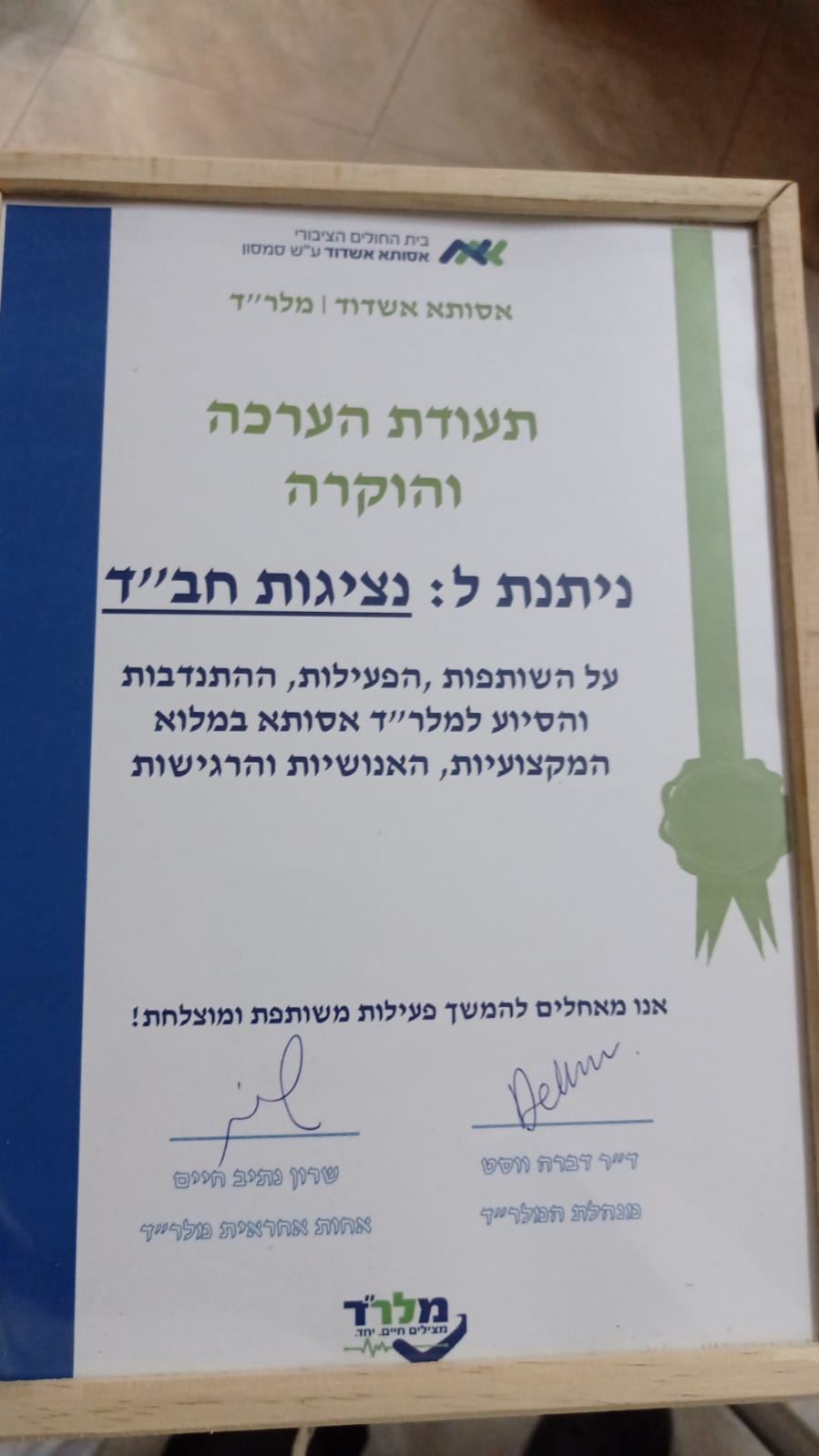 תודה לנציג חב"ד: מנהלת מלר"ד 'אסותא', ד"ר דברה וואסט, ייסדה במלר"ד מנהג נאה, כאשר בכל יום מתקיים מעמד של הדלקת נר חנוכה המיועד לצוות חדר המיון במסגרתו מביעים תודה לאלו שסייעו לצוות - שכידוע מספק מענה במשך 24/7 לכל הבאים לבית החולים.