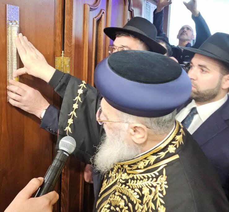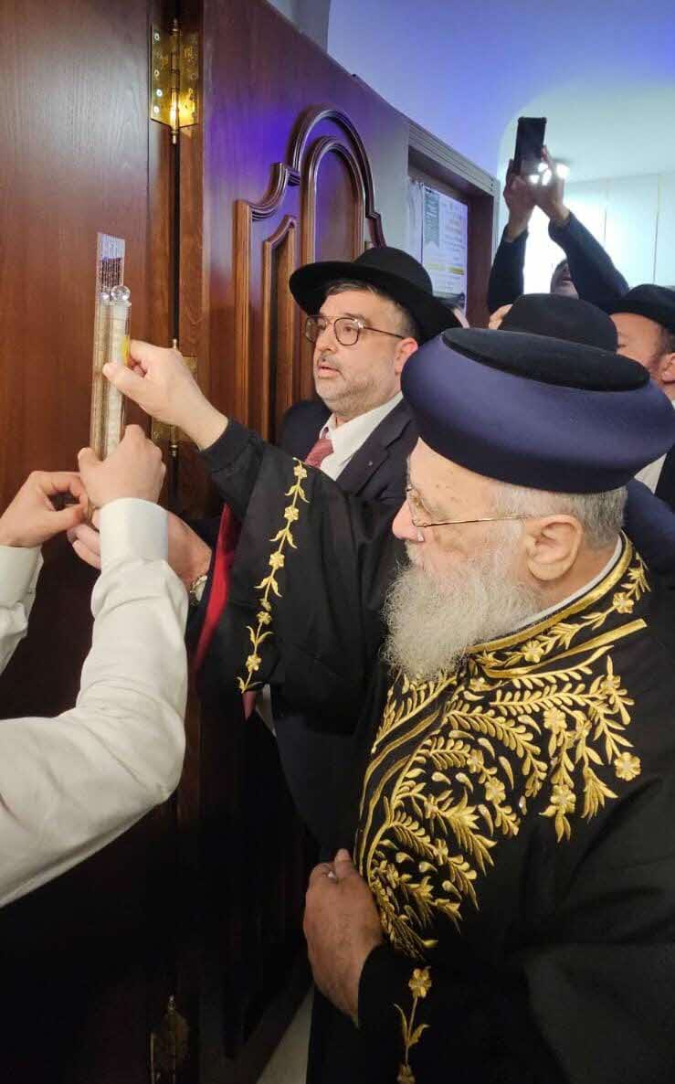 בצאתו כובד הראשון לציון הגאון רבנו יצחק יוסף שליט"א בעל ה"ילקוט יוסף" בקביעת המזוזה לפתח הראשי בבית המדרש לאחר שקבע בירך את כל הנוכחים שיראו ברכה והצלחה מתוך רוב נחת בריאות ושמחה כל הימים.