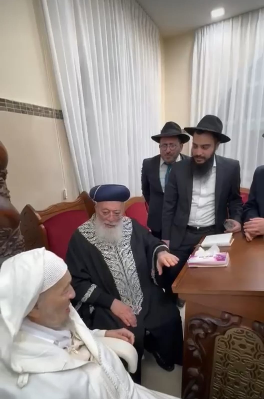 האדמו"ר הבבא ברוך התאמץ וקם לכבוד מרן שליט"א הרב האורח ונתן את מקום מושבו ודיברו על רבני שושלת המשפחה, כשבסיום סיים את השיחה ש"כל דבריהם כגחלי אש זכותם יגן עלינו ועל כל עם ישראל בכל מקום אשר הם".