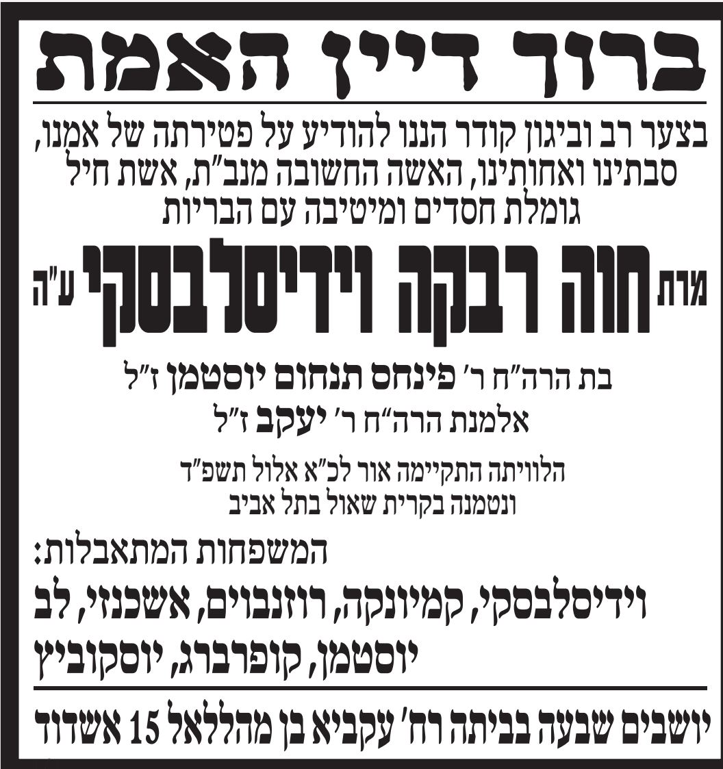 ברוך דיין האמת: מרת חוה רבקה וידסלבסקי ע"ה