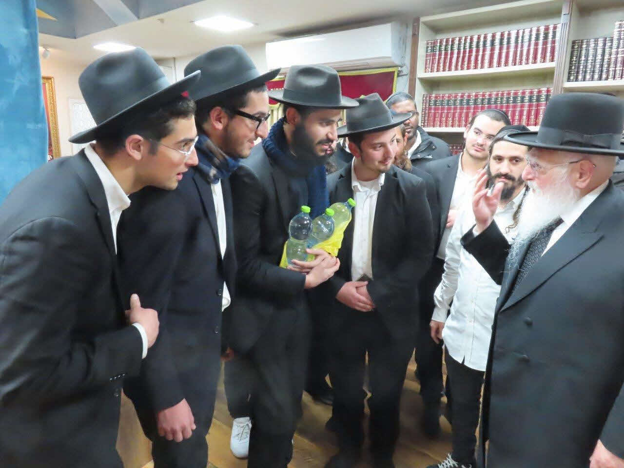 הבחורים הגישו 2 בקבוקי מים לברכה והניח את שני ידיו על הבקבוקים ואמר את הפסוק: "ועבדתם את ה' אלוקיכם וברך את לחמך ואת מימיך והסרתי מחלה מקרבך" ובירכם שישמעו ויתבשרו בבשורות טובות יחד עם כל עם ישראל.