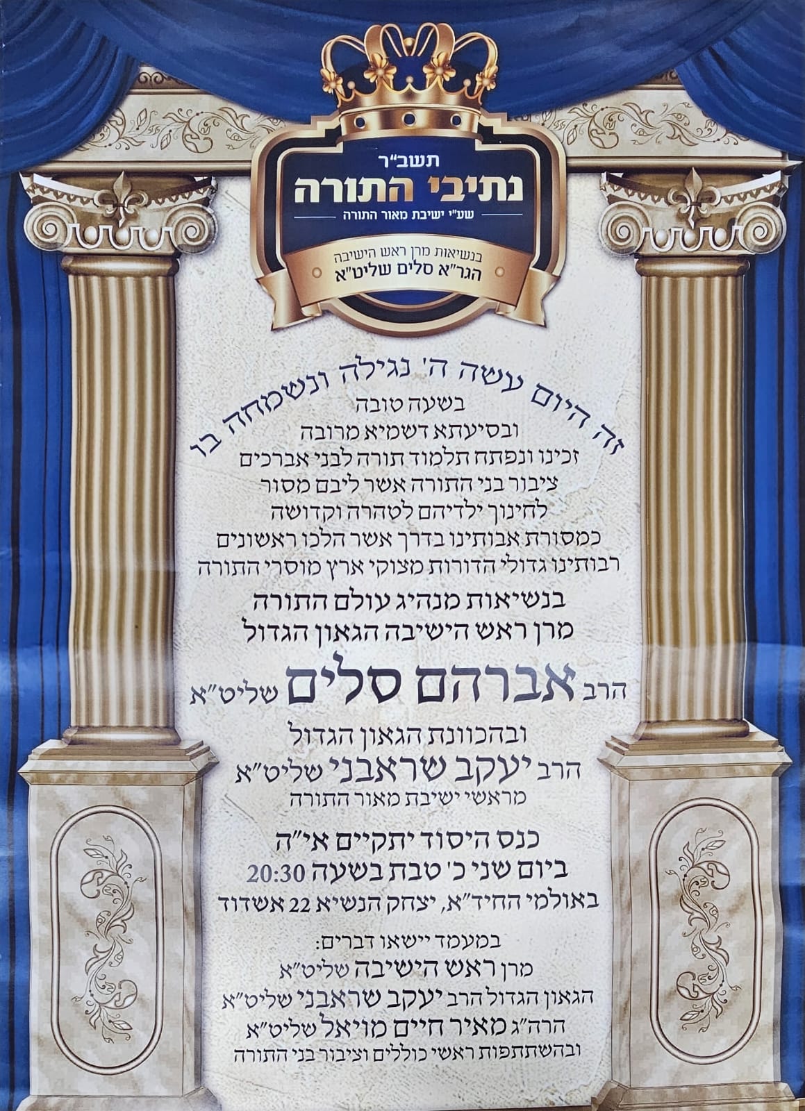 בראשות חבר מועצת חכמי התורה וראש ישיבות "מאור התורה" הגאון הגדול רבי אברהם סלים שליט"א והגה"ג רבי יעקב שראבני שליט"א מראשי ישיבת מאור התורה, התקיים הערב כנס ההקמה של תלמוד התורה "נתיבי התורה" החדש שייפתח לקראת שנה הבאה ע"י מקים עולה של תורה ונשיא ממלכת התורה בעיר אשדוד הרה"ג מאיר מויאל שליט"א, כמו"כ בכנס השתתף מ"מ ראש העיר ויו"ר שס אשדוד רבי אבי אמסלם.