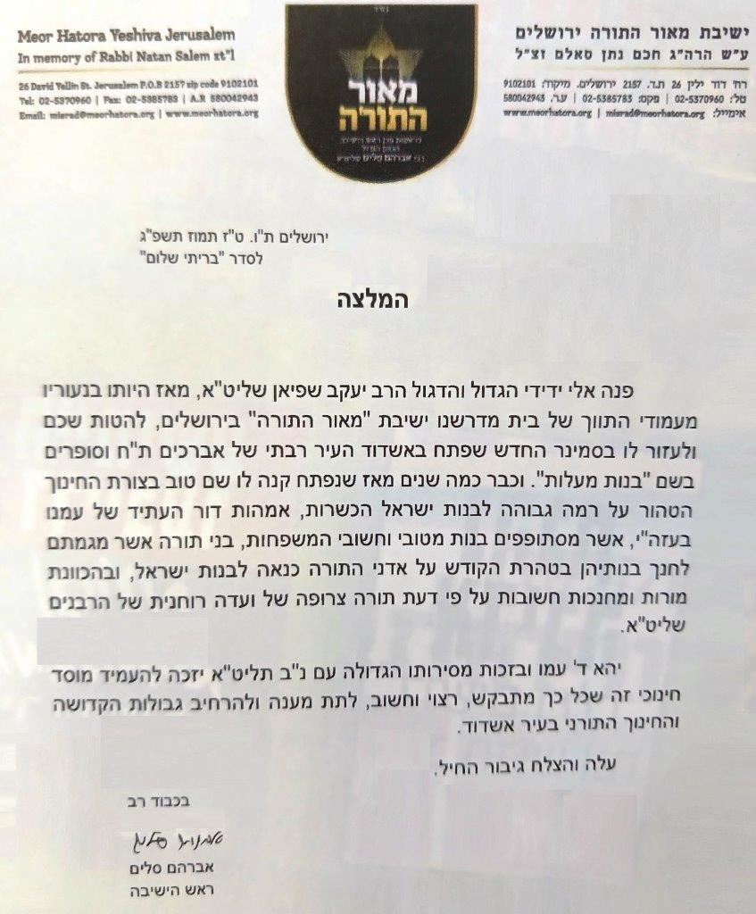 שמחה והתלהבות בקרב ציבור בני התורה בהקמת סמינר "בנות מעלות" תיכון בית יעקב לבנות אשדוד והסביבה בברכתם ובנשיאותם של מרנן ורבנן גדולי התורה שליט"א