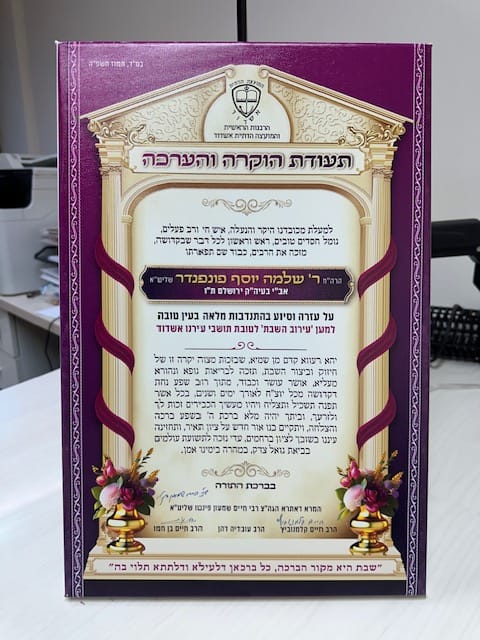 במעמד צנוע ומכובד התקיים הענקת "תעודת הוקרה והערכה" לעסקן העירובין הרב שלמה יוסף פונפנדר הי"ו, העוסק במשך תקופה ארוכה בהתנדבות ובמסירות רבה בחיזוק הגדרות, העמודים והחוטים המשמשים את קו העירוב שבעירנו באמצעות כלים ומכשירים ובציוד יעודי ברמה גבוהה המשמשים לצורך מטרת קודש זו.