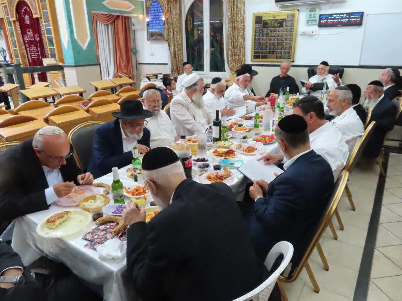 הרב דהן וציבור המשתתפים הודו לרב האורח הגרח בן שימול על דבריו המרתקים, בכוס של ברכת המזון כובד הרב דניאל אלחייאני מותיקי מתפללי בית הכנסת ומתלמידיו של אוד מוצל מאש רבינו גרשון ליבמן זצ"ל מנובהרדוק.