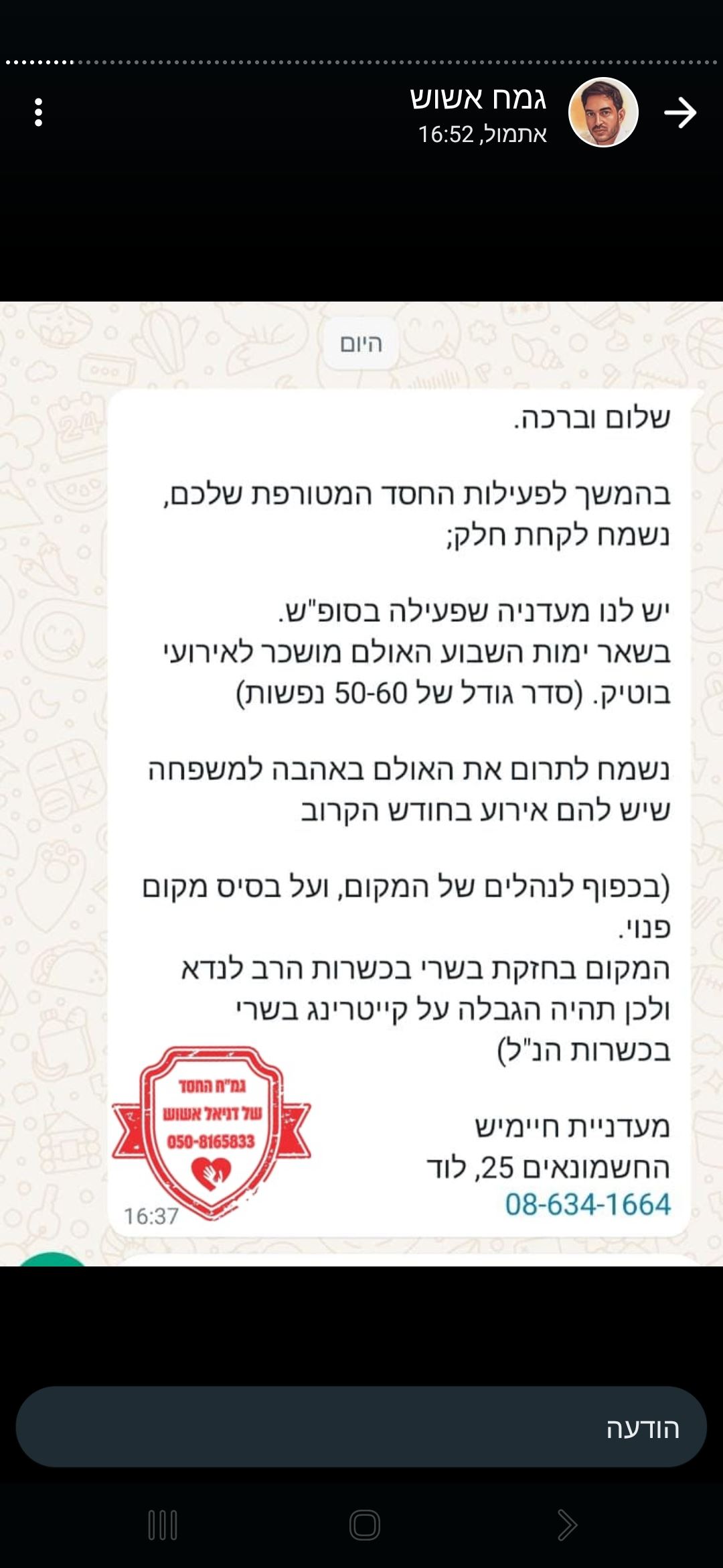 ההתלהבות למעשי החסד בגמ"ח של דניאל אשוש רק מתרחבת. אחרי שדיווחנו אתמול על היוזמה למעשי חסד, היום היוזמות רק מתרחבות. בעלי עסקים מציעים הדרכות, טיפולים, ושירותים שונים כולל מוזיקה וארוחות לחתונות - חינם אין כסף | מי כעמך