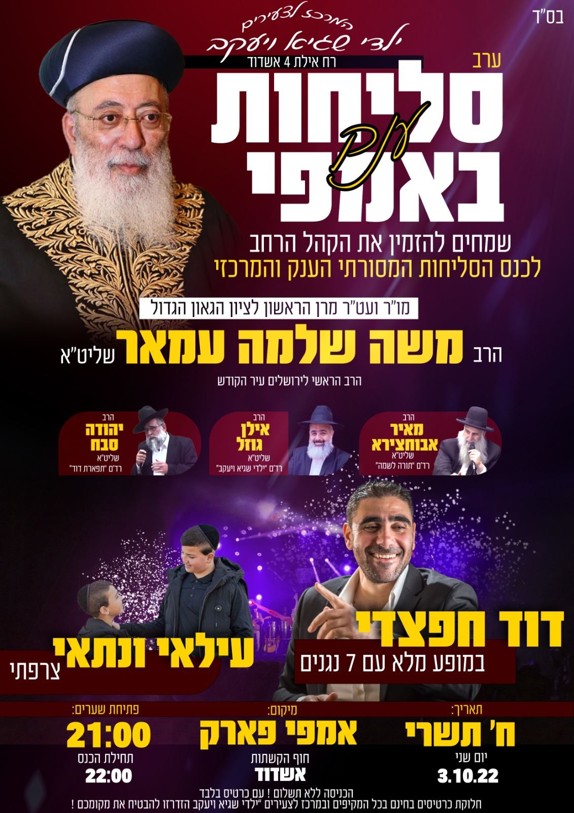 במעמד הראשל"צ הרב עמאר ובהשתתפות אלפים: סליחות ערב יום הכיפורים ב'אמפי', ביוזמת ילדי שגיא ויעקב