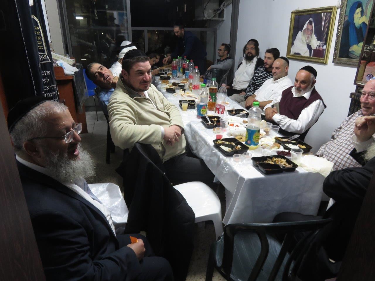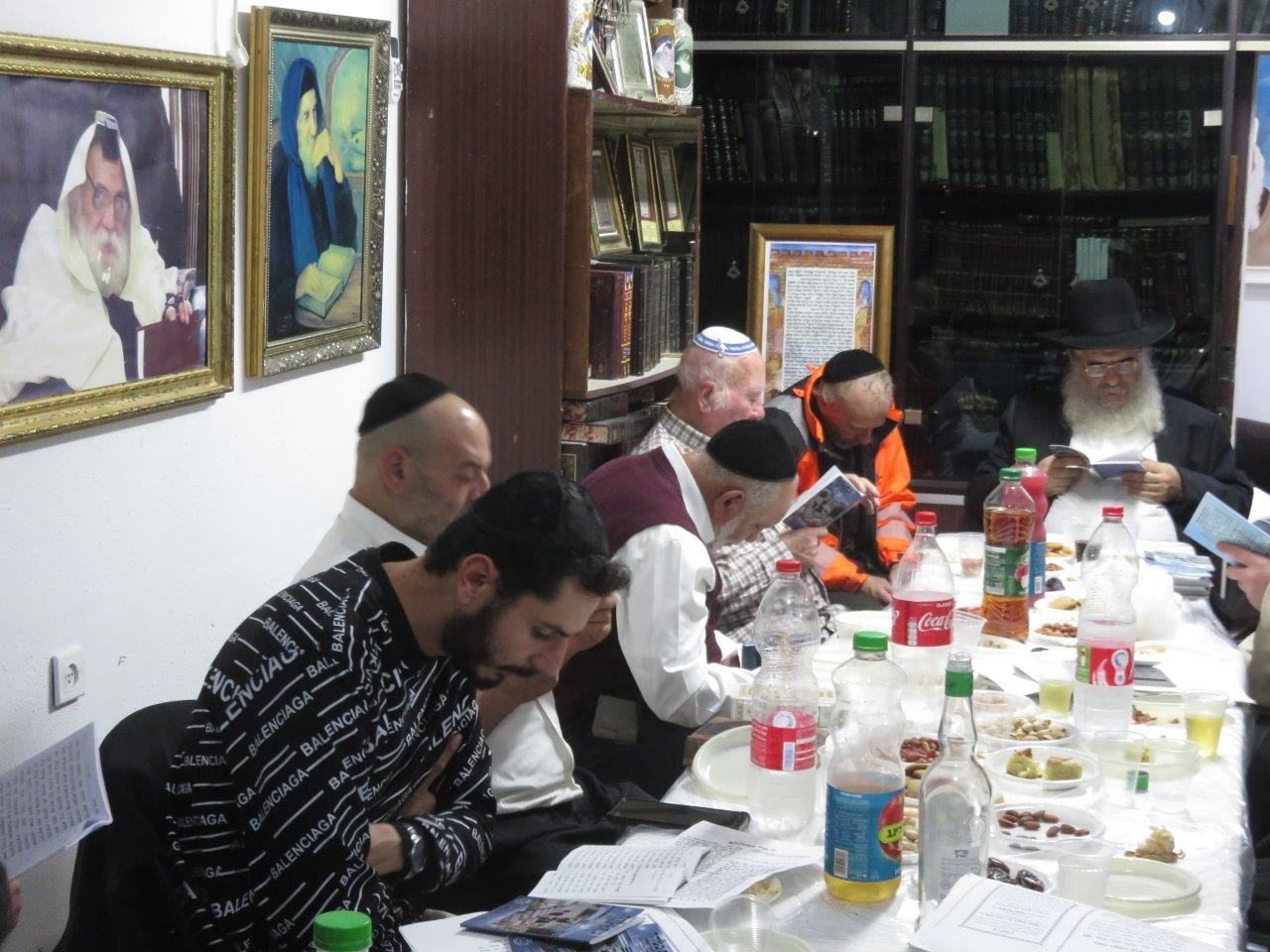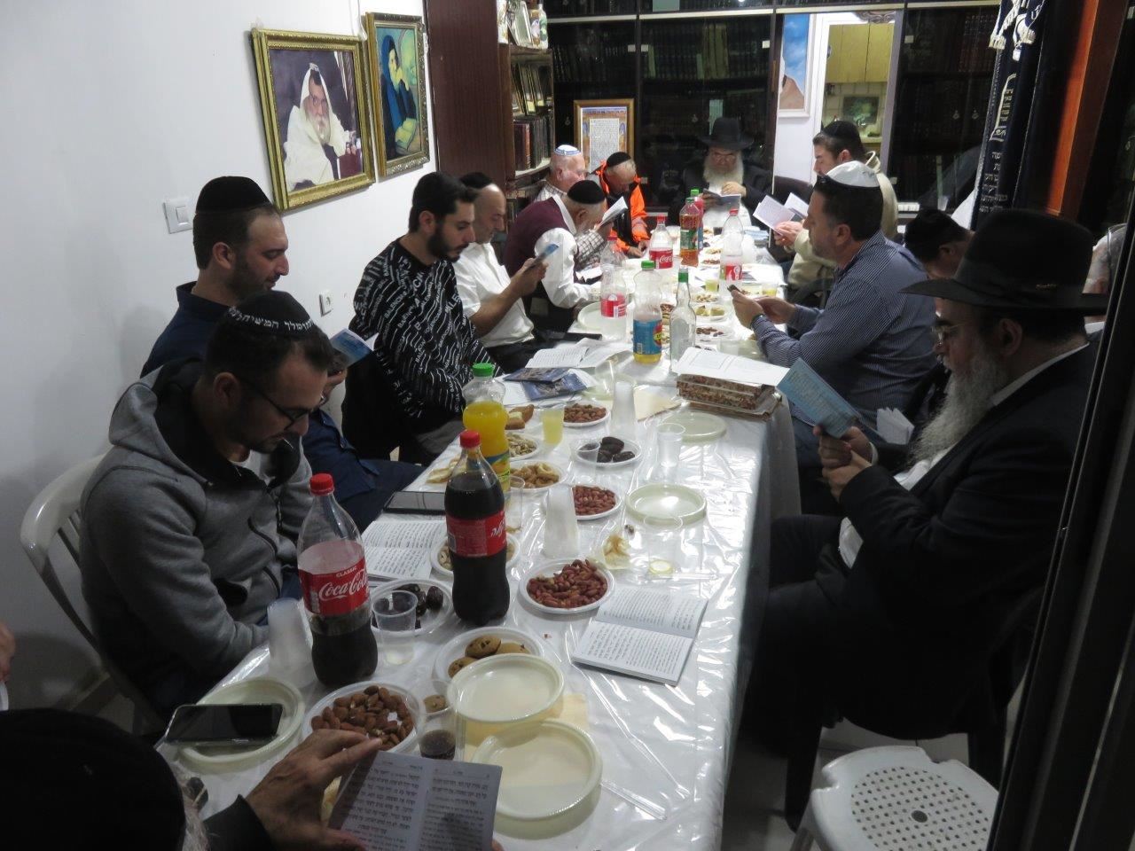לאחר תפילת ערבית החל סדר הלימוד, משניות, זוהר ותהילים ובסיום אמר את הקדיש בנו יחידו הדיין הגאון רבי יוסף פרץ שליט"א מו"צ בבד"ץ "משפט וצדק" ולאחר מכן הציבור היסב לסעודת מצוה שבמהלכה נשא דברי תורה הגר"י פרץ. אחריו נשא דברים חתנא דבי נשיאה הרה"ג ר' חיים ברגיג ר"מ ישיבה לצעירים "כסא רחמים" שהזכיר גם ממידותיו הנעלות של הרב זצ"ל שהיה ידוע בשקידתו בתורה והנהגתו בעבודת ד' המיוחדת שהיתה בו, כשרואים את רבי בן ציון זצ"ל הוא היה ספר מוסר ממש! היה לסמל ולדוגמא בקיום מצוות במסירות נפש של ממש בכל עת ושום דבר לא היה מעכב בעדו, כך גם לא ויתר על תפילה בציבור הגם שזה היה קשה מאוד עבורו.