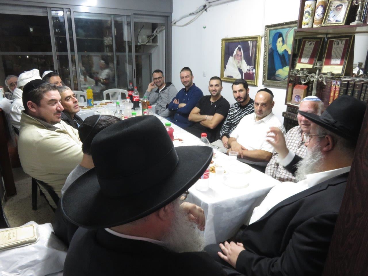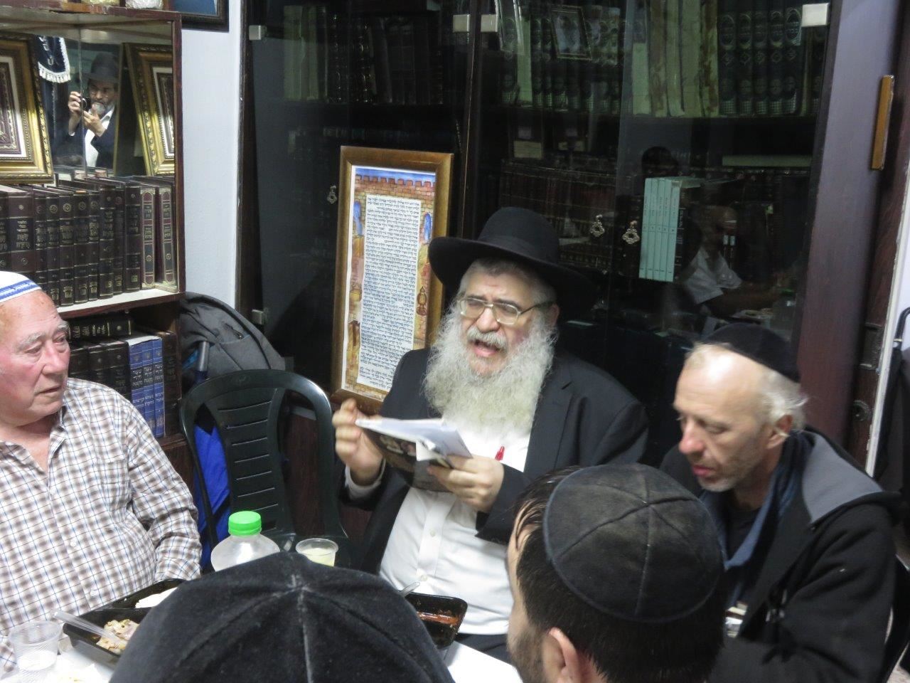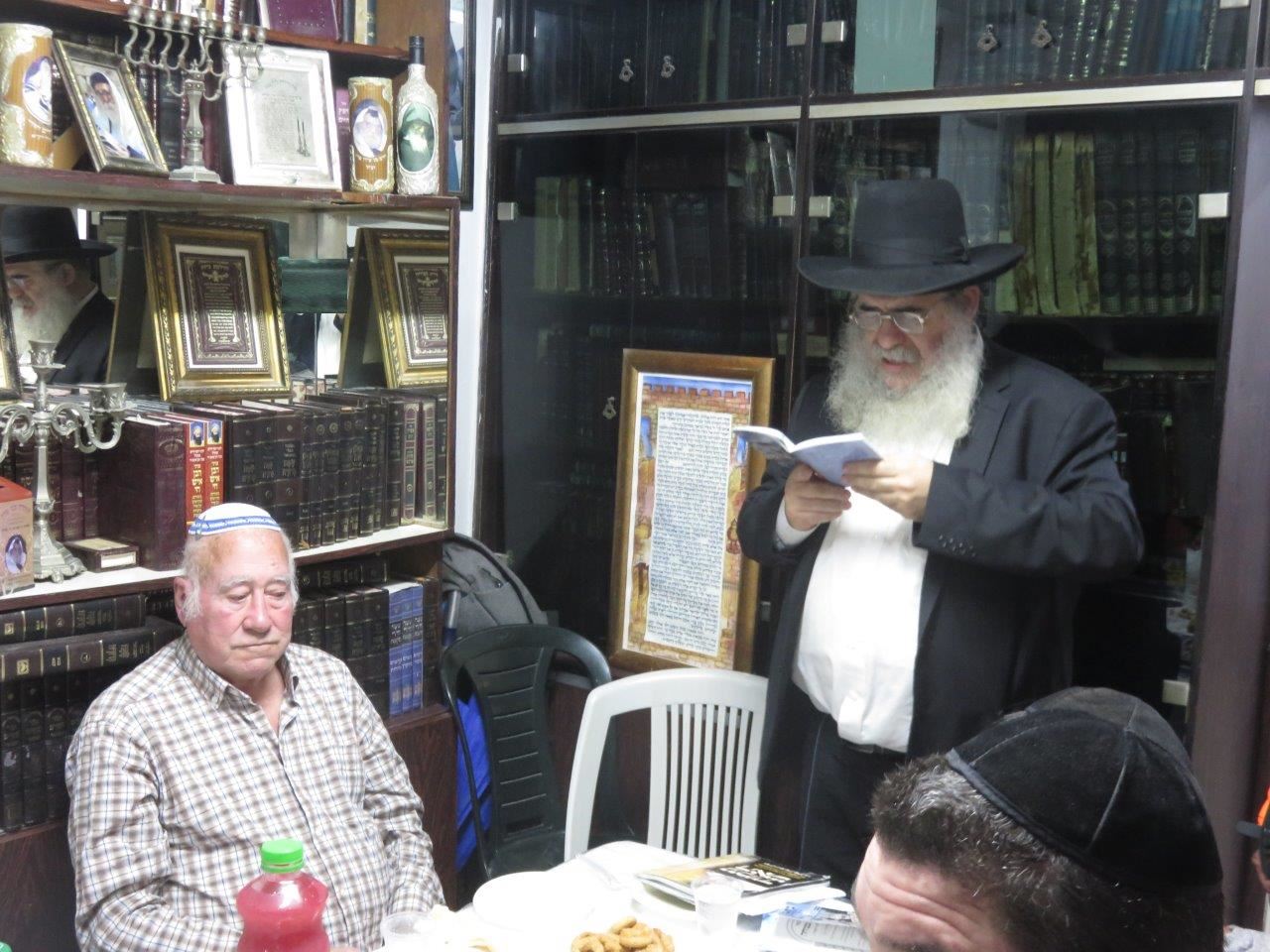 עם התכנסות האורחים בבית הרב זצ"ל נשמעה האזעקה ומיד אחר כך פתח בדברי תורה הרה"ג ר' מאיר מוייאל ר"י "זוהר התורה" שזכה להכיר את הרב זצ"ל קרוב ל-30 שנה, בדבריו תיאר את רום גדולתו של הרב זצ"ל בעבודת ה' בצניעות מופלגת שלא ניתן לתאר והביא עובדות והנהגות ממסכת חייו המופלאה. סיפר כי זכה לבקרו בבית החולים בשנה האחרונה ולא יכל לאכול והגישו לפניו תחליף למאכל בנוזלים שטעמו טפל ומר, וכששתה את המאכל, הודה לה' יתברך בשמחה ובהתלהבות כאילו אכל מאכל משובח ביותר ואמר ששמח בגלל שבזכות זה יהיה לו עוד קצת כח ללמוד תורה ולהתפלל.