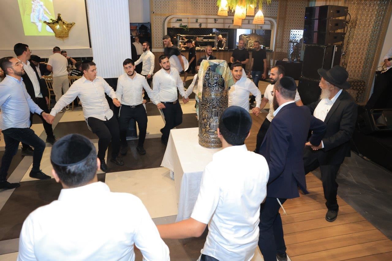 שם במהלך הסעודה, תזמורת הנעימה את הערב בשירים לכבודה של תורה, הציבור קם ממקומו ופצחו במעגלים ובריקודים יחד עם ספר התורה ורקדו ארוכות.