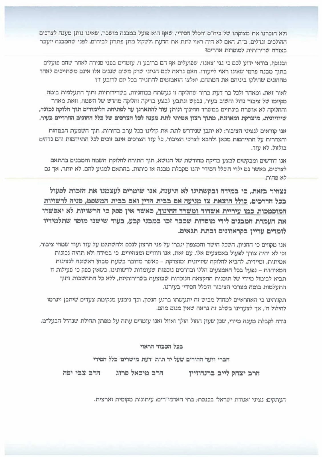 "ברגע שישנם משאבים, ואין זה משנה אם מדובר בתקציבים או בשטחים, החלוקה נעשית בין שלושת הקהילות הגדולות ואילו ילדי הכלל חסידי משלמים את המחיר. אז זהו, שמה שהיה לא יהיה, ואם הדרישה לא תיענה אנו נפנה לכל הגורמים בדרישה לביטול ההקצאה".