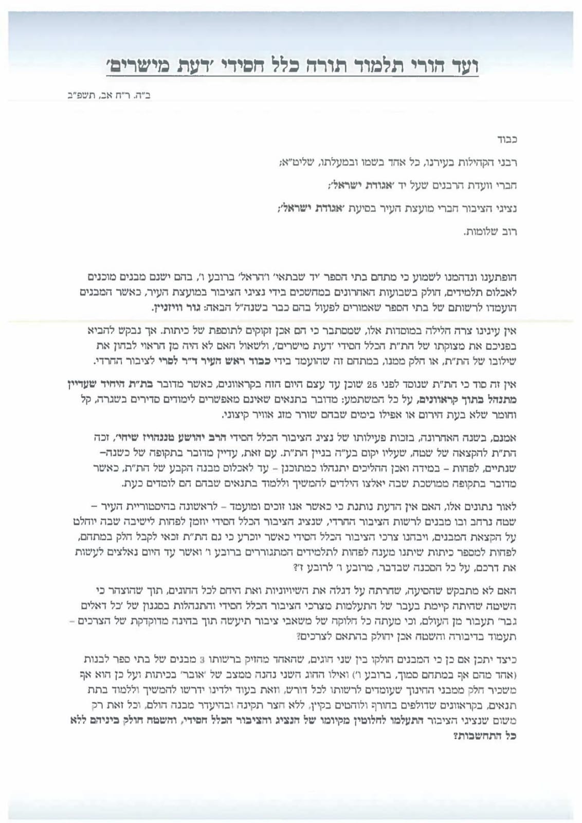 סערה בעיר אשדוד: בעיתוי קריטי, רגע לפני תחילת שנת הלימודים תשפ"ג, פורסם אתמול מכתב עליו חתומים חברי 'ועד ההורים של ת"ת כלל חסידי דעת מישרים' ובו דרישה לביטול ההקצאה שנעשתה "במחשכים ובכח הזרוע" במסגרתה חולקו מבני בתי הספר 'הראל' ו'יד שבתאי' לחסידיות ויזניץ וגור, בעוד שילדי הת"ת ממשיכים ללמוד בקרוואנים.