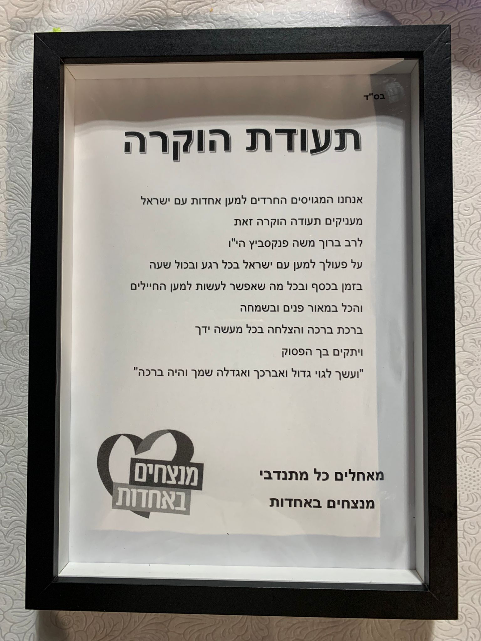 במרכז הארוע קרא הרב מרגלית לר' ברוך משה פינקסוביץ, מי שמאז החלה המערכה הוא מנצח בגאון על קבוצת המתנדבים שגוייסה למשימה והוא יוצא ערב ערב לשמח את חיילי צה"ל, והוא העניק לו תעודה בשמם של החיילים והמתנדבים.