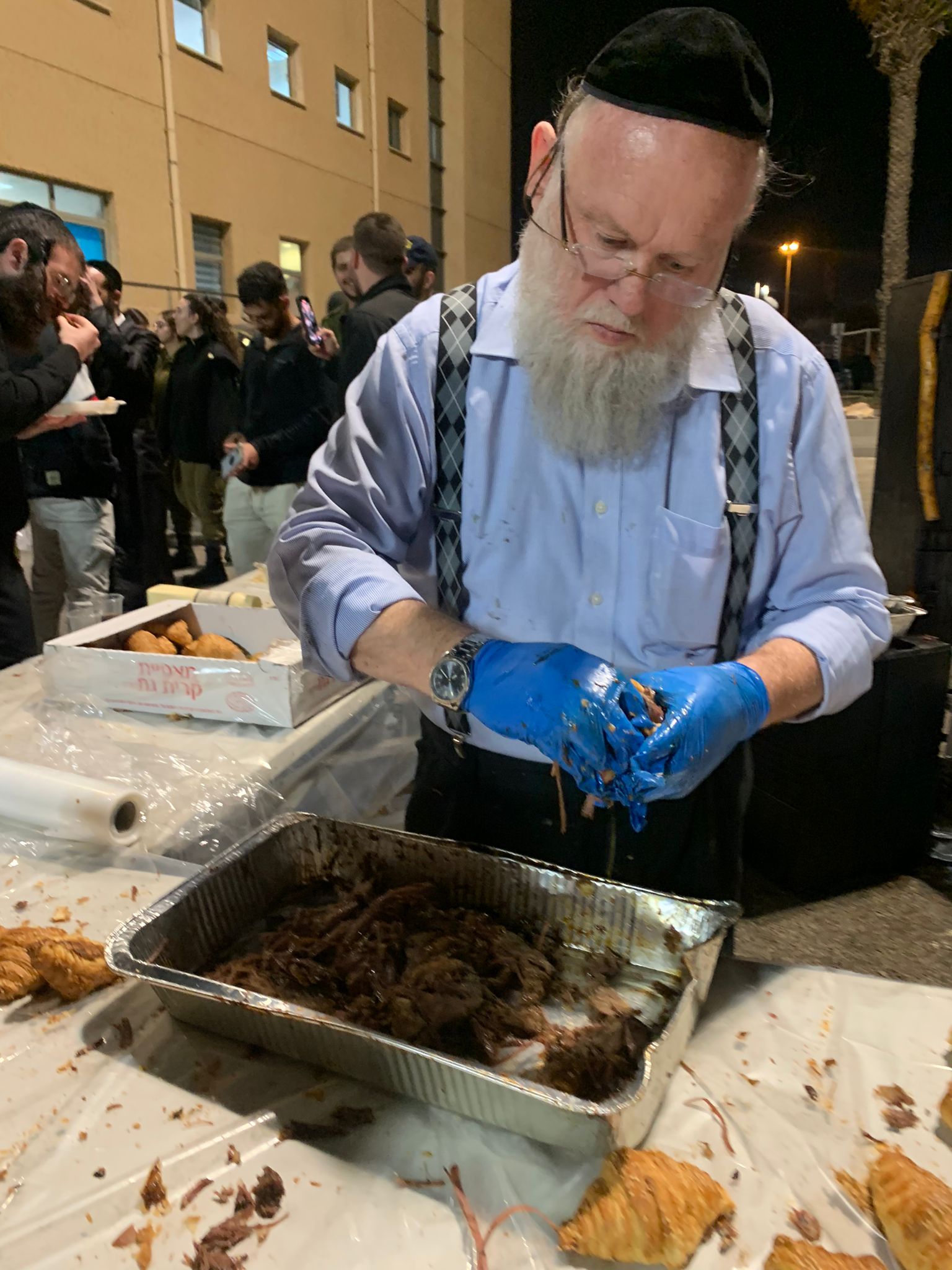 המתנדבים, בראשות הרב ברוך פינקסוביץ ור' שמוליק קליין, שהגיעו כדרכם כשהם מצויידים בבשרים מכל הסוגים, מתקני גריל, ירקות, פיצוחים וחטיפים, התמקמו בבסיס כאשר יחד עמם הגיעו גם מתדבים נוספים מהעיר וכן משמח הלבבות הרב יהושע מרגלית.