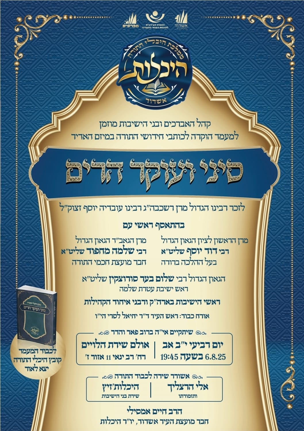 קהל בני התורה בעיר, נרגשים לקראת המעמד לכבודה של תורה לפאר ולרומם את עמלי התורה וכותבי חידושי התורה במיזם האדיר 'סיני ועוקר הרים' שע"י המרכז לבני התורה 'היכלות', שיתקיים הערב יום רביעי י"ב אב באולמי "שירת הלויים" רח' רבי ינאי 11 אזור ז'.