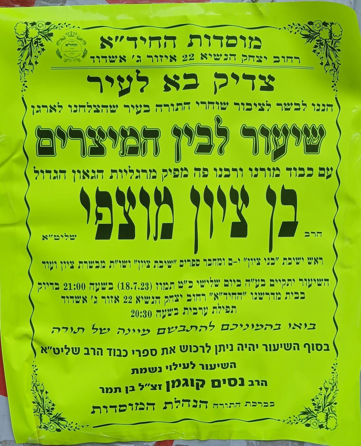 הערב יום שלישי ערב ראש חודש אב יתקיים שיעור מיוחד לימי בין המצרים מפי המקובל הגה"צ רבי בן ציון מוצפי שליט"א ראש ישיבת "בני ציון" ומחבר הספרים הנודעים "שיבת ציון" ושו"ת "מבשרת ציון". השיעור יתקיים במוסדות החיד"א ברובע ג' בשעה 21:00.